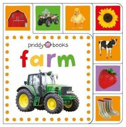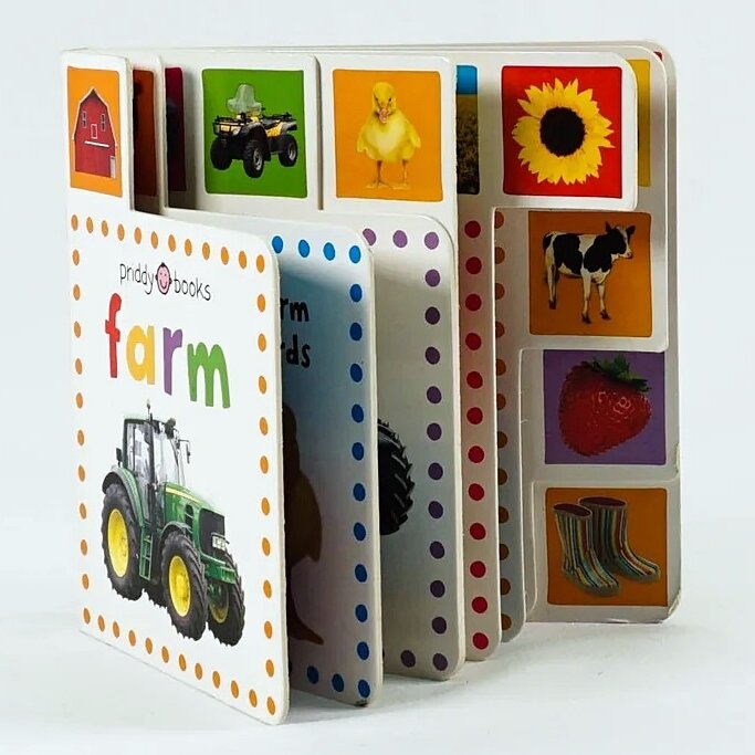 Mini tab books: Farm is a photographic board book designed to capture any baby's or toddler's attention. The colorful images of familiar objects, crops, animals, and farm vehicles will help young children learn all about the farm. The chunky format is also ideal for building dexterity and the tabs make turning the pages super easy!
