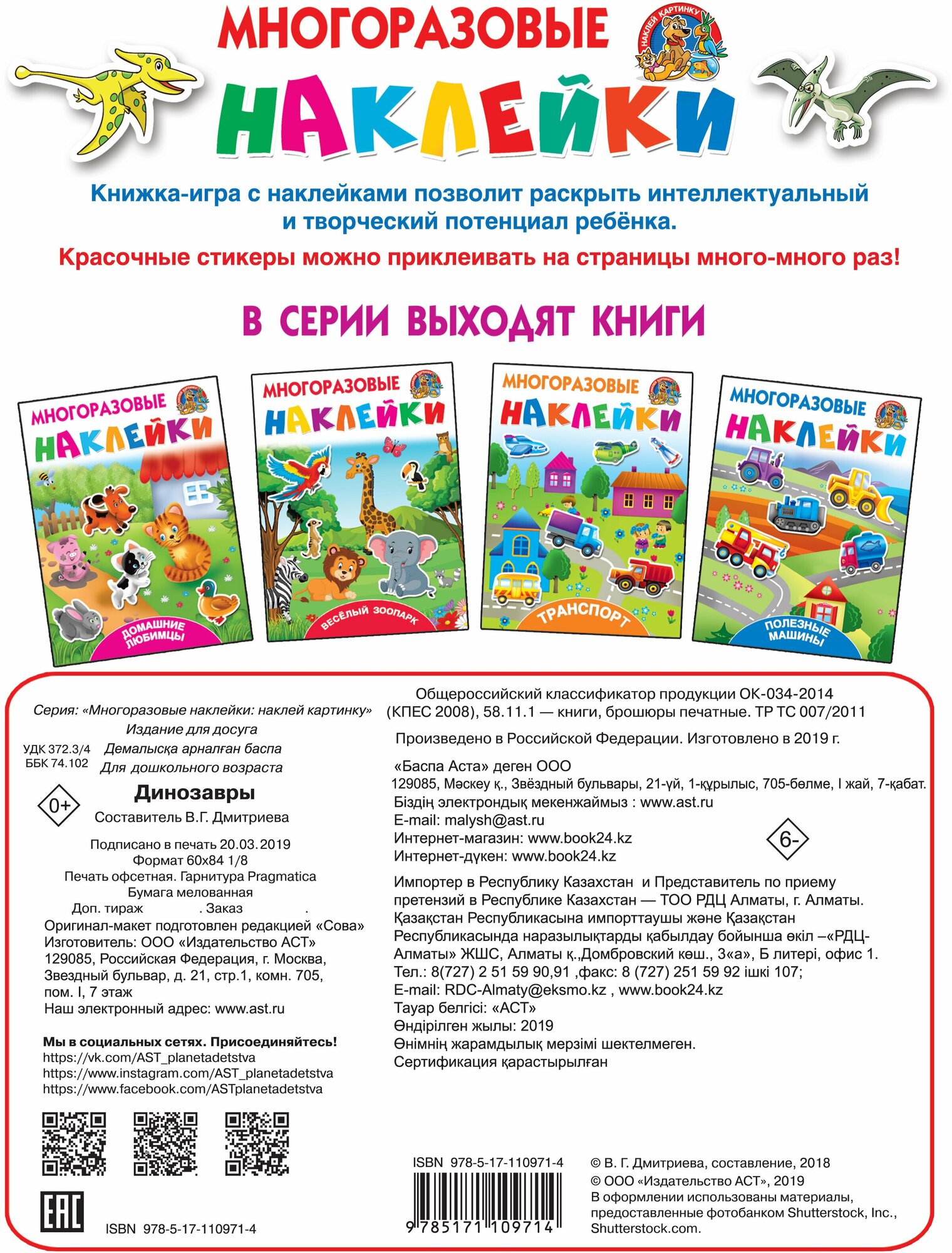 "Динозавры" - настоящая находка для любознательных малышей. Прекрасно иллюстрированная книжка с многоразовыми наклейками познакомит дошколят с миром динозавров - ребята выучат их названия, запомнят, как они выглядят. И конечно, смогут пофантазировать, наклеивая динозавриков то на одну страничку, то на другую, ведь наклейки - многоразовые!