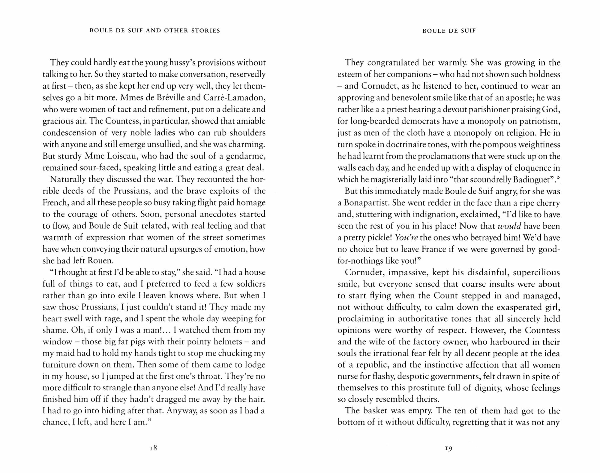 A carriage transporting ten passengers fleeing from Rouen is stopped at a village inn by Prussian soldiers, who decide to detain them until one of their party, the prostitute Boule de Suif, consents to sleep with their officer. When Boule de Suif refuses to do so on account of her principles and patriotic sentiments, the solidarity initially manifested by her fellow travellers becomes increasingly tested as the deadlock continues, and the strained relationship between her and her "respectable" counterparts gradually worsens. A scathing satire of bourgeois prejudice and hypocrisy and a compelling snapshot of France during the 1870 Franco-Prussian War, `Boule de Suif' - here presented with five other major stories on the lives of prostitutei - was declared a masterpiece by Flaubert and is widely considered to be Maupassant's finest short story.
