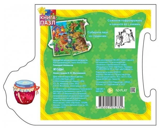 Книга-пазл – забавная книжка, которая превращается в веселую и забавную игру! Книжка состоит из пяти картонных листов, скрепленных пластиковой пружиной, которую легко снять. На каждой странице – короткое веселое стихотворение и фигурка-вырубка, выступающая за пределы страницы. Малышу будет легко и интересно переворачивать листы книжки, держась за прочные выступающие элементы. Если снять пластиковую пружину, пять листов превращаются в детали пазла. Нужно выбрать четыре нужные детали, составляющие картину, и собрать из них пазл.