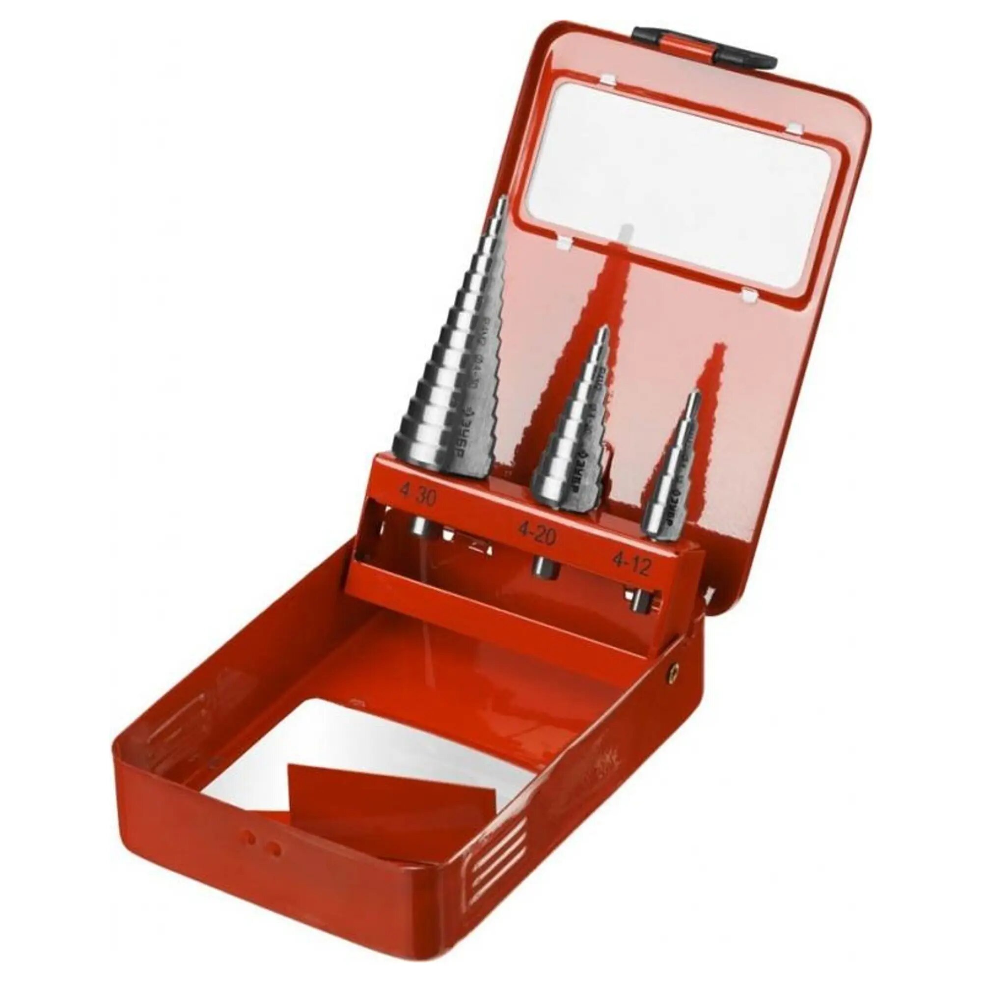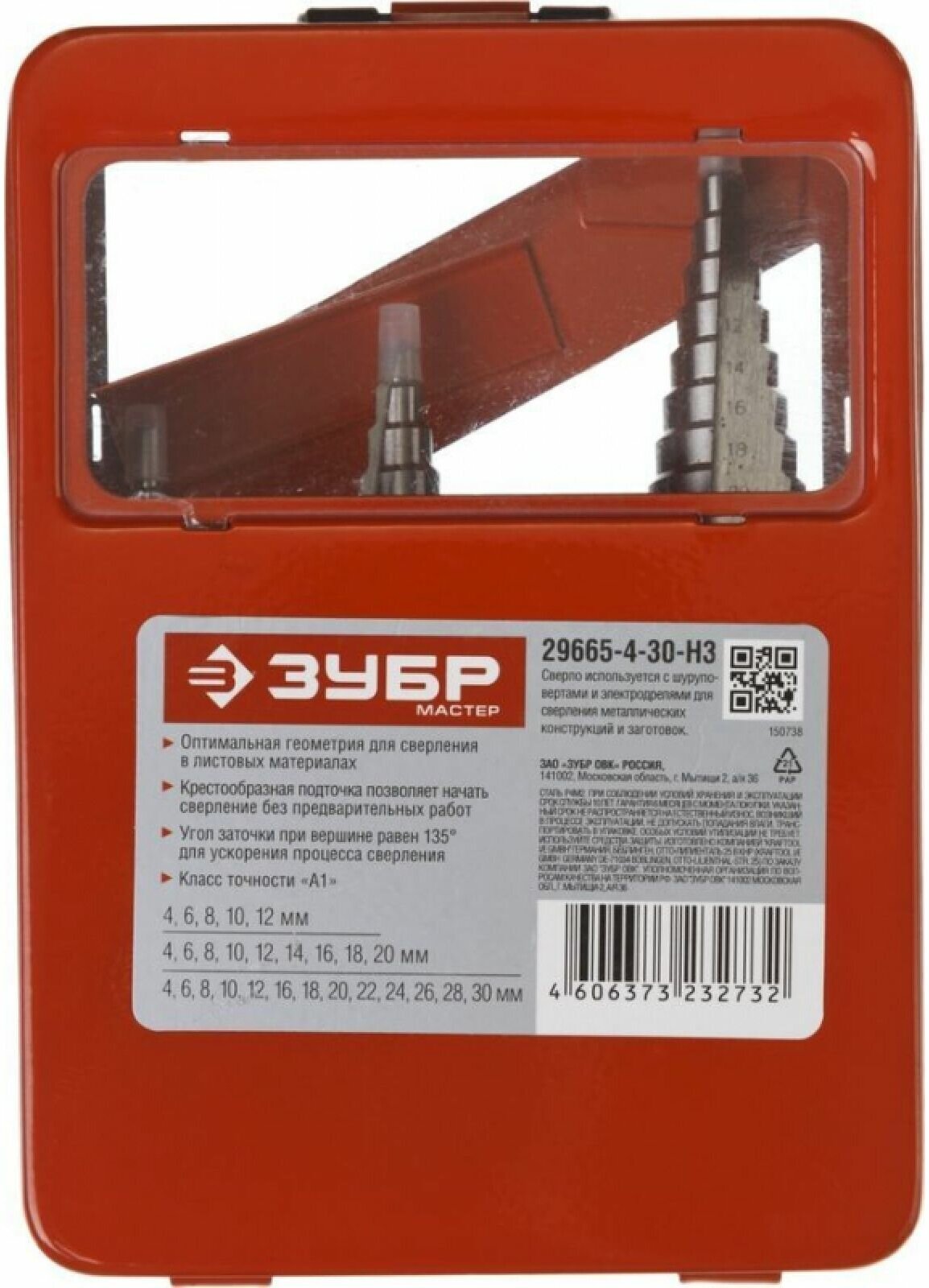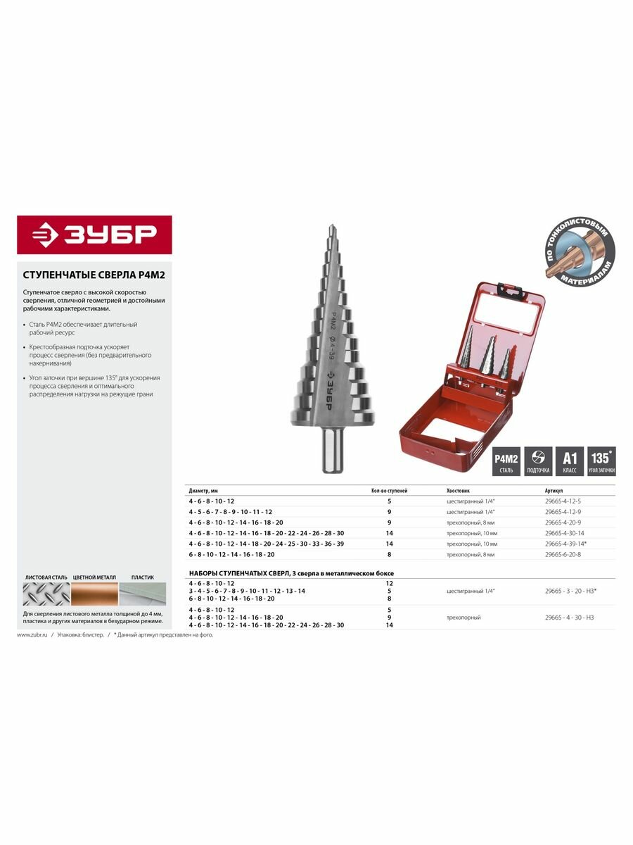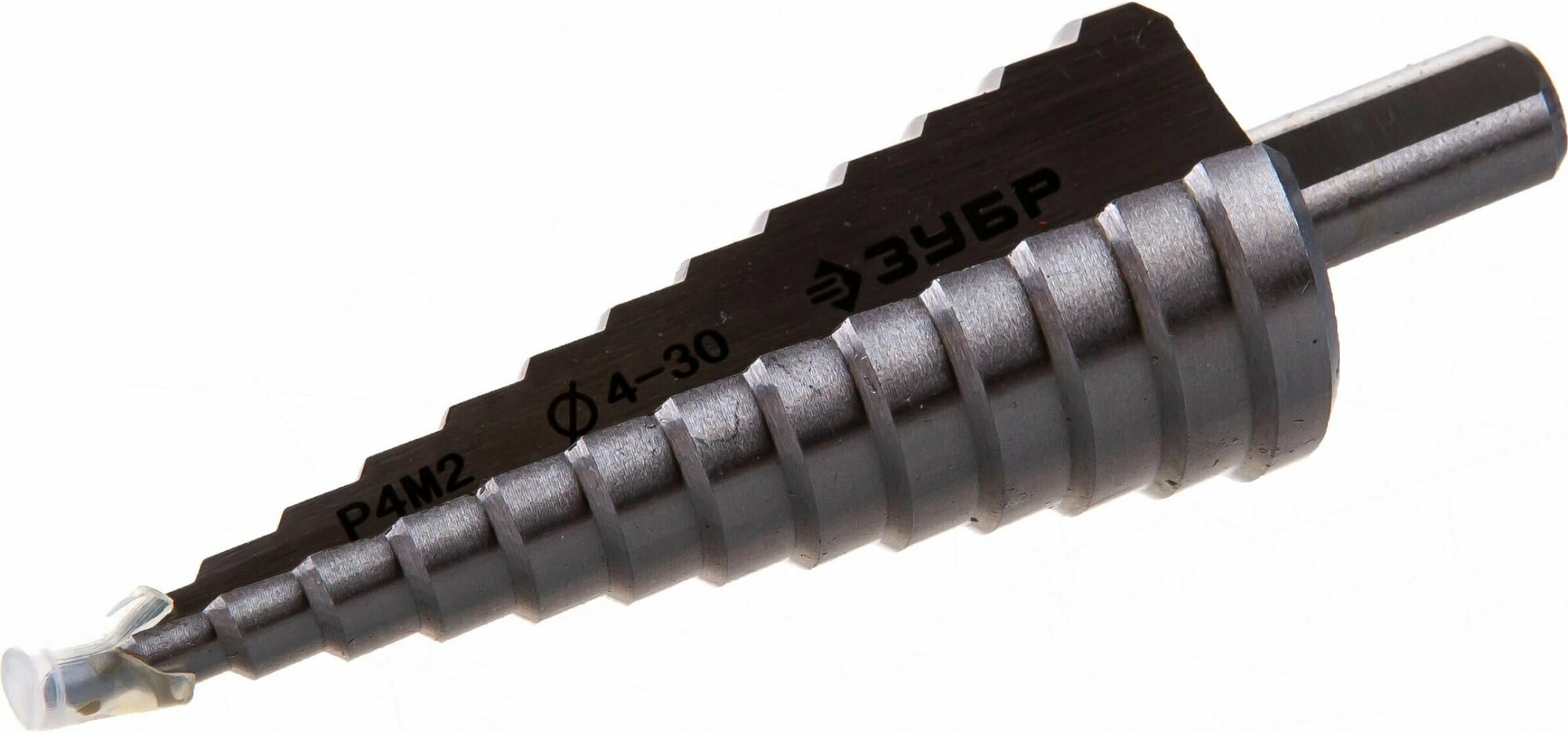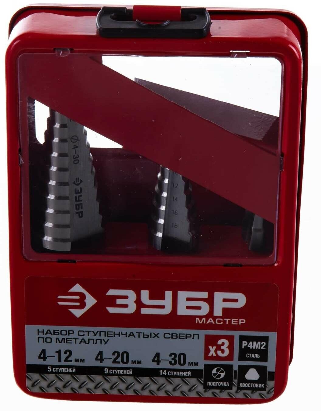 Набор ЗУБР "МАСТЕР": Ступенчатые сверла по сталям и цвет.мет., быстрорежущая сталь, d=4-12мм,5 ступ. d=4-20 мм 9 ступ., d=4-30мм 14ступ.
