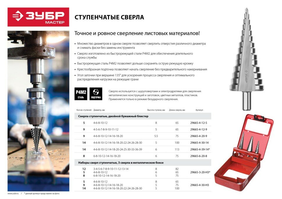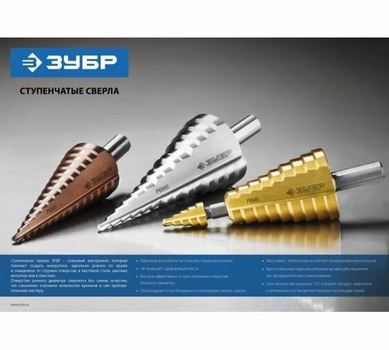 Ступенчатые сверла ЗУБР специально разработаны для поэтапного сверления отверстий большого диаметра в различных металлических конструкциях и заготовках.