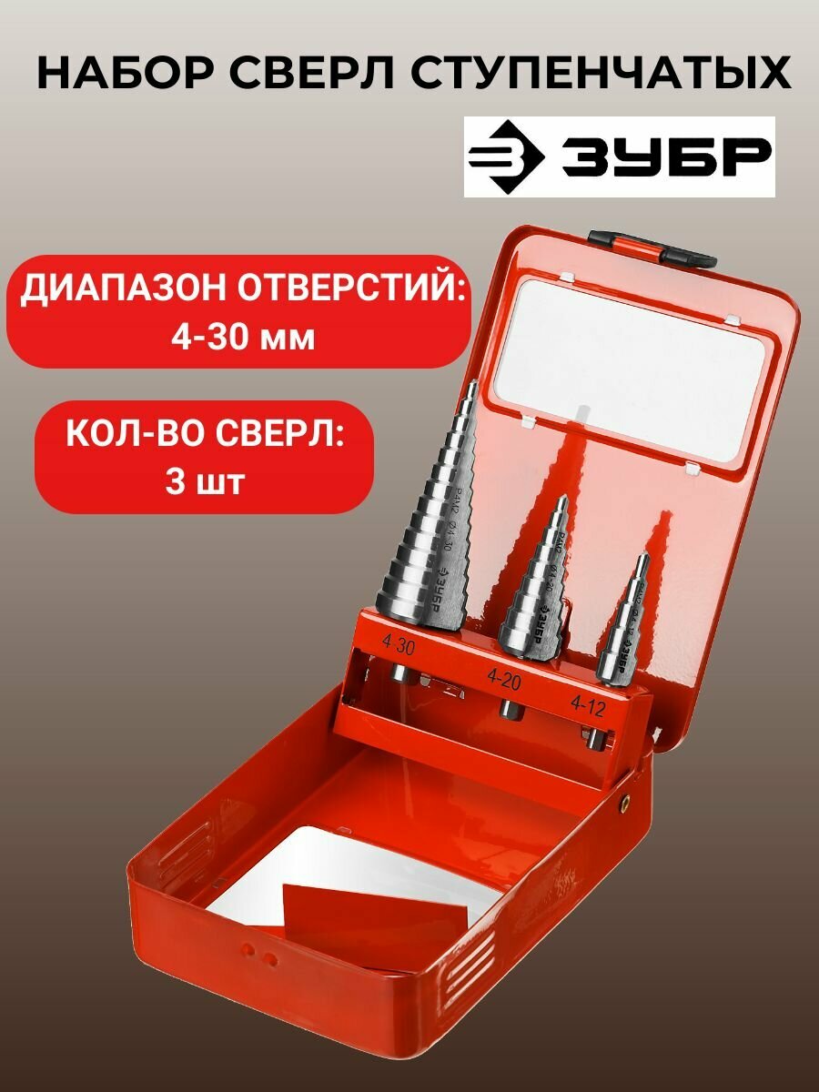 Набор сверл ступенчатых Зубр 3 шт., 4-30 мм