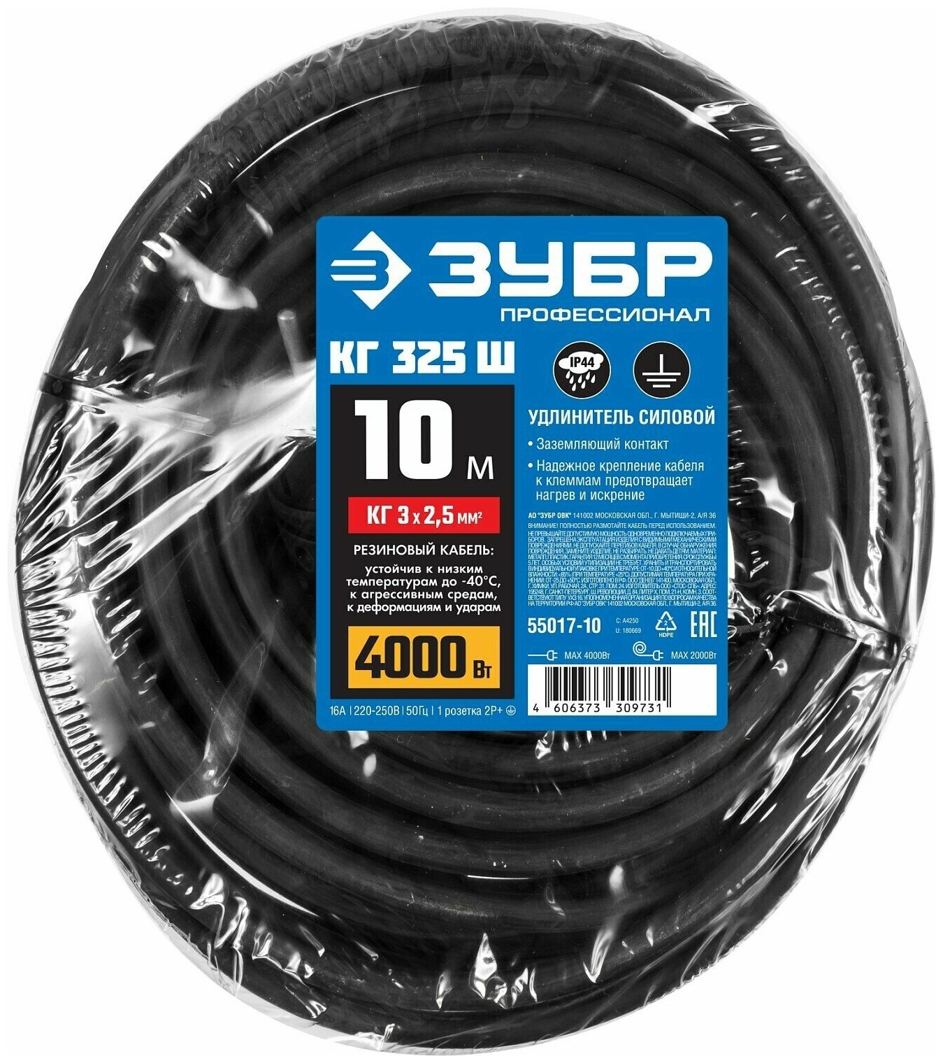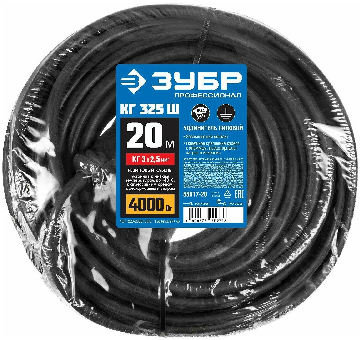 Удлинитель силовой Зубр 3x2.5кв.мм 1розет. 30м КГ 20A без катушки черный 55017-30