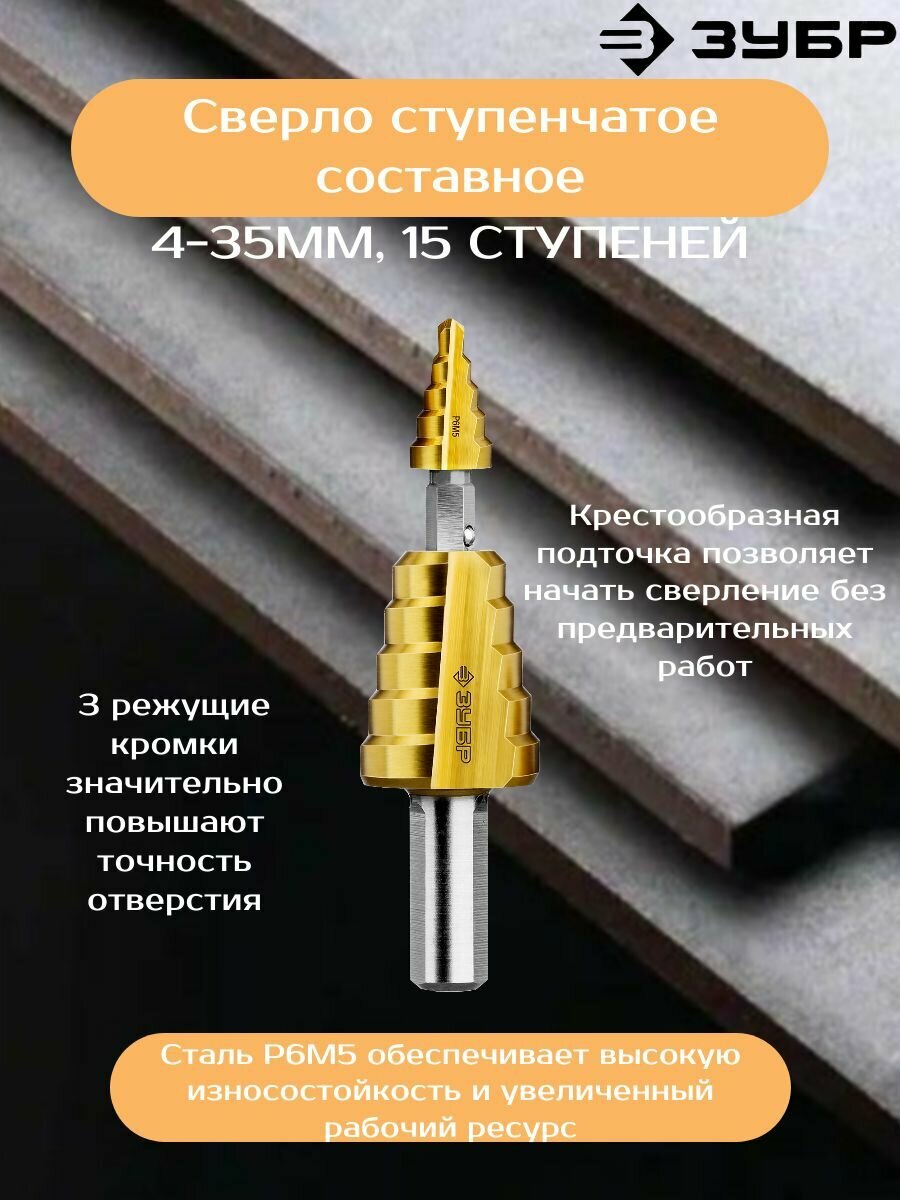 Высокоточное ступенчатое сверло с нитрид-титановым покрытием – максимально функциональное и надежное изделие в линейке ЗУБР. Двухмодульная конструкция, широкий диапазон рабочих диаметров и особо прочное покрытие гарантируют лучший результат сверления и максимально долгий срок службы. Особо прочное покрытие нитридом титана повышает стойкость режущей кромки на максимально долгий срок. 2-модульная конструкция позволяет использовать каждый модуль по отдельности.