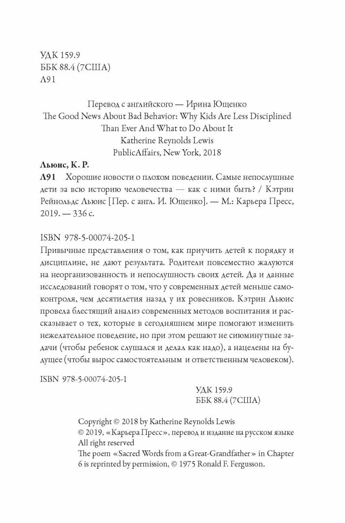 Кэтрин Льюис провела блестящий анализ современных методов воспитания и рассказывает о тех, которые помогают изменить привычное (и нежелательное) поведение. Прочитав эту книгу, родитель будет смотреть на поведение своего ребенка не с тревогой, а с интересом, как на возможность выстроить прекрасные отношения с детьми. Вы будете уважать в своих детях личность и при этом спасете свою семью от хаоса.