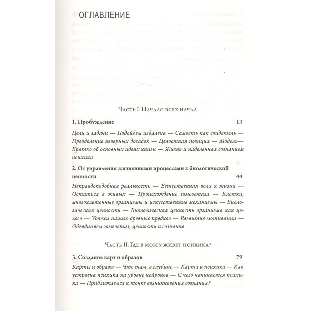Хороший язык и прекрасное описание сложных вещей. Предпринята попытка грамотно описать процессы Осознания переживаний реальности, суть которых образы, и которые незаметно усиливают четкость осознания себя и окружающего мира, что начинается в разных аспектах той структуры,которую автор именует самостью: отправная точка это то, что может называться сенсорная протосамость (отправная точка на базовой самости,которая представляет собой карту образов ощущений и еденную совокупность невральных паттернов, миг за мигом составляющих карты стабильных проявлений физического состояния организма, а основой сознания является состояние бодрствования, зависящее от тесной взаимосвязанной работы гипоталамуса, стволовой части и церебральной коры и образы, которые связаны с любым действием мозга картирующего все, что он делает, появляются карты познаваемых объектов и действий, когда создается репрезентация различных характеристик организма в действии, и категоризированы знания, переведены в символы и с ними стало возможно что-то делать в воображении и в процессе мышления и при этом протосамость это простейщие ощущения живого организма и импульс базовой самости как первого представителя управления базовыми индивидуальными жизненными процессами с точки зрения биологической ценности для жизни, концентрирует внимание на физическом теле , в котором обретается и возникает тогда, когда протосамость чувствует изменения от того, что происходит взаимодействие организма и объекта и в результате этого порождены и видоизменяются образы какого-то объекта, с которым повзаимодействовали