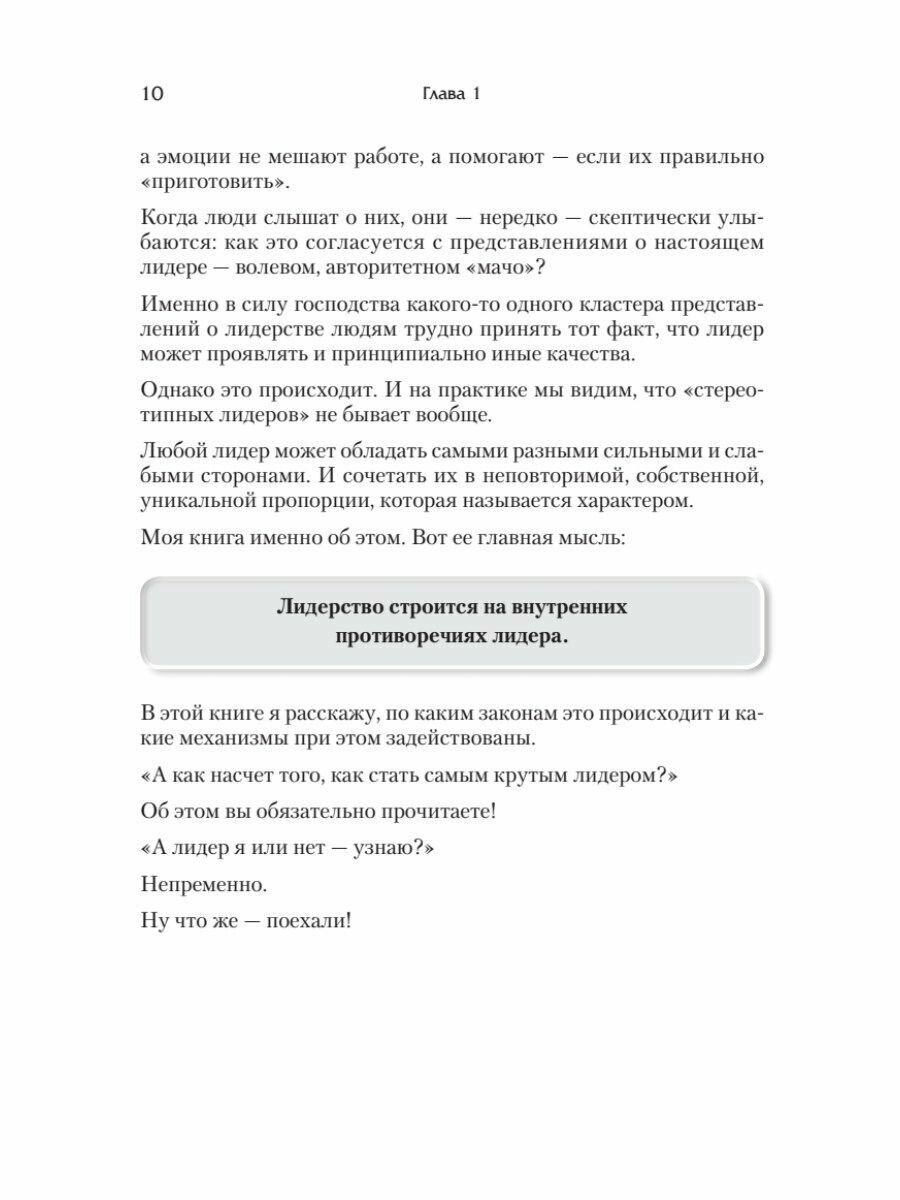 Книга меня разочаровала. Книга — претензия на труд, классифицирующий и характеризующий такое качество руководителя, как ЛИДЕРСТВО. Книга не отвечает на вопрос, что такое лидерство, каким оно бывает, как его отточить на практике. Книга не подводит даже к тому, чтобы читатель задумался, что лидерство — это феномен. Как идти к тому, чтобы этот феномен рассмотреть, ощутить, в чём заключается главный парадокс лидерства. За набором общераспространённых штампов в книге просматривается нежелание автора исчерпывающе говорить на эту тему. Автор опирается на американскую школу лидерства, и в то же время пытается охарактеризовать нынешнее положение дел в России с этой позиции. И этим вызывает огромный диссонанс, вызывая чувство поверхностности и мишуры. Книгу можно смело было бы назвать "Как можно быть лидером". Книга скорее всего описательная, чем исследующая. Выхолощенная. Прочитать её можно только в таком качестве, чтобы рассмотреть как лидером по такой книге не стать.Книга —заказ Соросовского фонда. По этой книге лидером стать не возможно. Неужели можно считать, чтобы книга написанная на гранты Сороса для России могла воспитывать подлинных лидеров (для враждебной страны) — не смешите мои тапочки. Такая и эта книга — пустая, надуманная, выхолощенная....