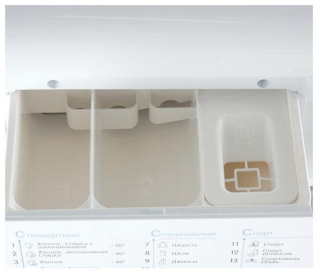 | Режимы стирки | стирка деликатных тканей, предотвращение сминания, стирка спортивной одежды, стирка верхней одежды, супер-полоскание, экспресс-стирка, предварительная стирка, программа удаления пятен |