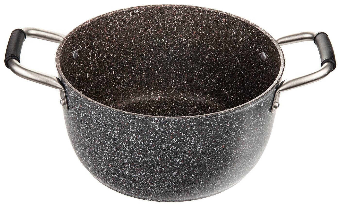 Кастрюля из прочного и легкого алюминия, вмещает 3.1 л и имеет приятную серую расцветку. Комфортной готовке способствует наличие утолщенного дна с качественным антипригарным покрытием.