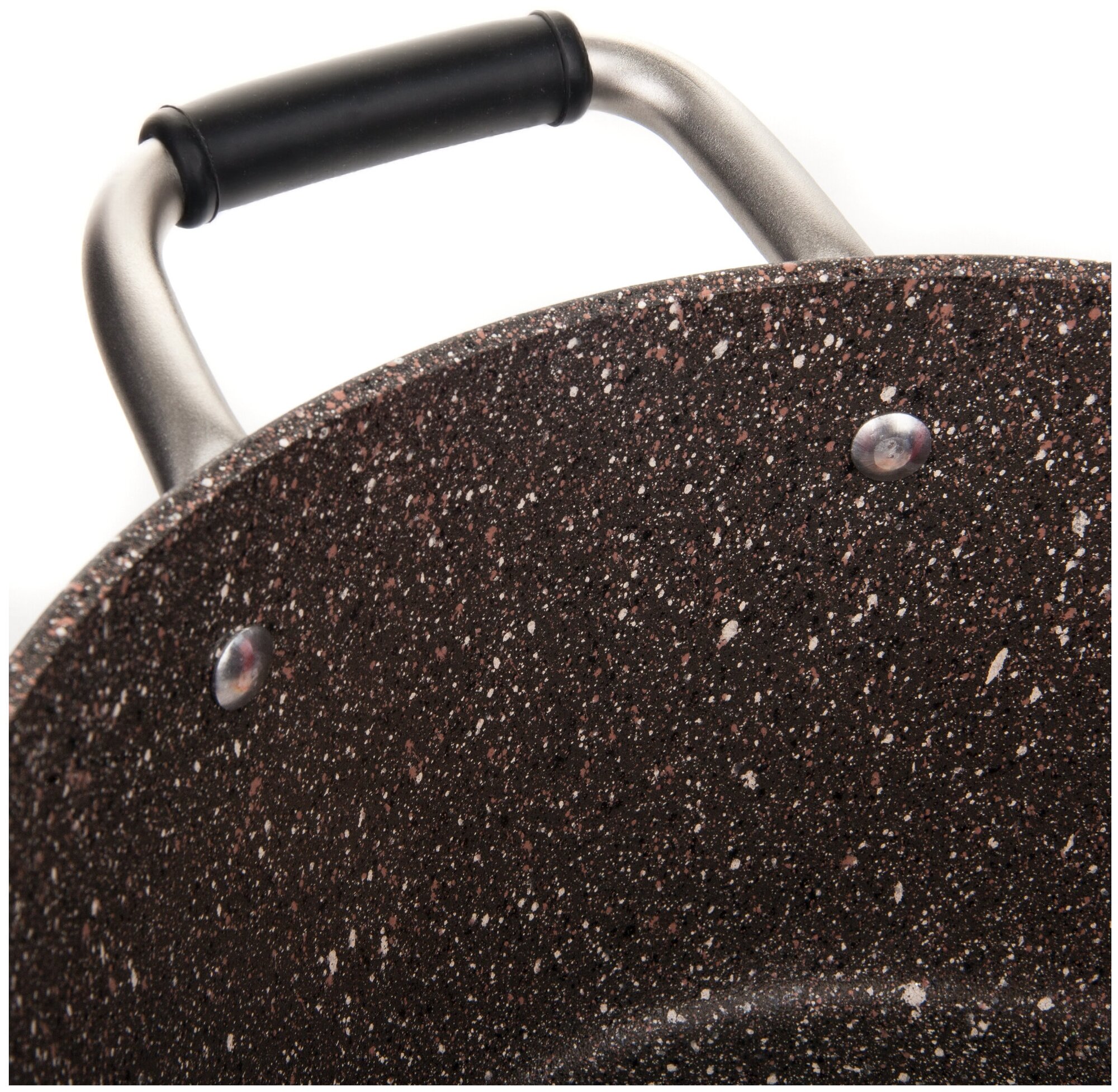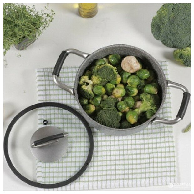 Кастрюля 20 см (3,1 литра) с утолщенным алюминиевым корпусом обладает отличной теплопроводностью. Антипригарное покрытие Quarzotek Pro самое инновационное из всех каменных покрытий. Стальные ручки с силиконовыми накладками позволяют использовать посуду и в духовом шкафу. Подходит для всех типов плит, за исключение индукционных.