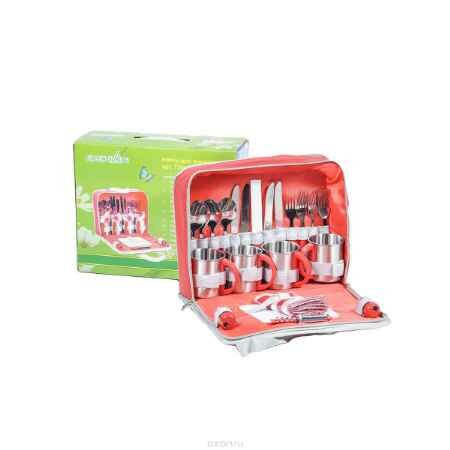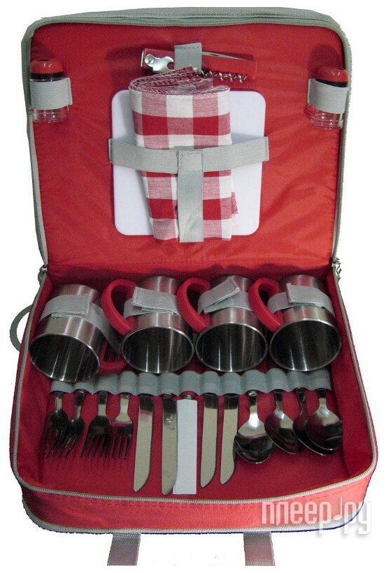 Набор для пикника Green Glade 26 предметов является незаменимой вещью для отдыха на природе и в дальних поездках.Для тех, кто любит отдыхать на природе с комфортом, был создан данный набор для пикника, в который входит все необходимое для пикника в расчете на 4 человек, а именно сумка-холодильник для продуктов и набор из столовых предметов.Столовые приборы и кружки изготовлены из полированной нержавеющей стали с пластиковыми ручками красного цвета. Салфетки выполнены из хлопка с принтом в клетку. Квадратная разделочная доска сделана из прочного пластика белого цвета, солонка и перечница - из прозрачного пластика. Все приборы компактно помещаются в специальную сумку из полиэстера, сумка закрывается на застежку-молнию; оснащена двумя удобными ручками для переноски и двумя вшитыми кармашка на молнии для хранения аксессуаров.КомплектацияИзотермическая сумка-холодильник (материал-полиэстер). Ножи, нержавеющая сталь, пластиковые ручки - 4 шт. Вилки, нержавеющая сталь, пластиковые ручки - 4 шт. Ложки, нержавеющая сталь, пластиковые ручки - 4 шт. Чашки нержавеющая сталь - 4 шт. Салфетки - 4 шт, материал - хлопок . Солонка - 1 шт. Перечница - 1 шт. Складной нож со штопором -1 шт. Нож для сыра/масла - 1 шт. Пластиковая разделочная доска - 1 шт. ХарактеристикиДлина вилки/ложки: 18,5 см. Длина ножа: 21 см. Диаметр кружки (по верхнему краю): 7,5 см. Высота кружки: 8 см. Размер разделочной доски: 15 см х 15 см. Размер салфетки: 31 см х 31 см. Размер солонки/перечницы: 3 см х 3 см х 5,5 см. Длина ножа со штопором: 11 см. Размер сумки: 32 см х 26 см х 11 см.