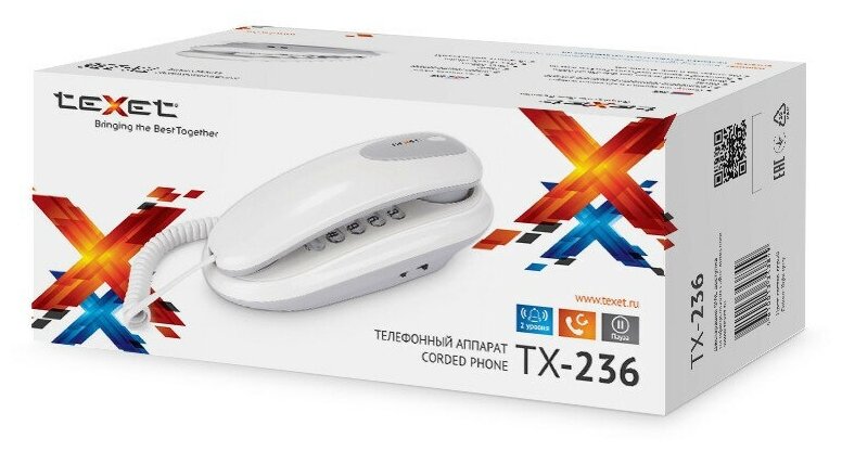 teXet имеет следующие функциональные возможности: повтор последнего набранного номера, регулировка громкости вызывного сигнала, пауза, сброс, тонально-импульсный способ набора номера. Удобная трубка и эргономичные формы проводного телефона делают его очень привлекательным и незаменимым помощником как дома, так и в офисе. При этом teXet не будет занимать много места, так как имеет небольшие размеры и настенное крепление.