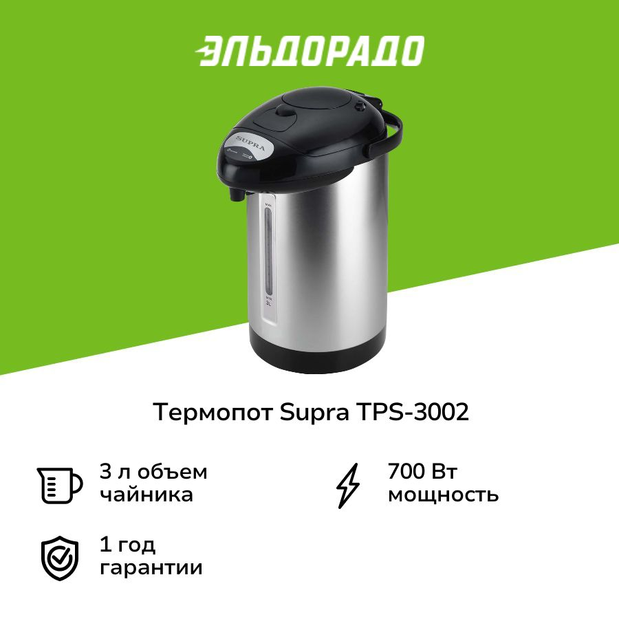 Термопот Supra TPS 3002 Термопот SUPRA объемом 3.8 л отличается компактными размерами и минимальными, но в то же время самыми необходимыми характеристиками. Высокая мощность 760 Вт при кипячении и мощность 35 Вт при поддержании температуры позволяют потреблять оптимальное количество электроэнергии. С помощью индикатора уровня воды вы всегда сможете узнать, сколько воды в термопоте осталось и сколько необходимо добавить.