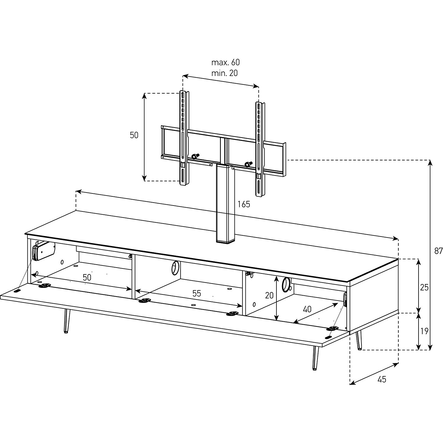 Закрытая стойка под телевизор премиум класса для больших телевизоров. Дверь открывается нажатием. Эффективный кабель-канал для маскировки всех кабелей и шнуров. Скрытые колесики, позволяющие плавно двигать тумбу с техникой, в случае необходимости. Например, протереть пыль за тумбой. В комплекте стойки инфракрасный ретранслятор сигнала (для пультов), то есть оборудование (ДВД плеер, спутниковый ресивер и пр.) внутри стойки будет работать с пульта при закрытой дверке. ТВ стойка оснащена универсальным поворотным кронштейном с возможностью регулировки телевизора по высоте.