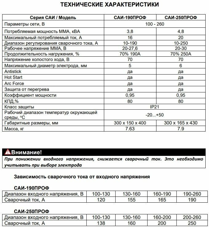 РЕСАНТА САИ 190 ПРОФ – мощный сварочный аппарат с инверторной технологией для ММА сварки, приспособленный к работе в сетях с пониженным напряжением (до 100 В). Сварочный ток – 10-190А. Преимущества: возможность работы от генератора мощностью 4,6 кВт; индикатор перегрева; регулируемая функция форсажа дуги; антизалипание; горячий старт; компактные габариты и небольшой вес.