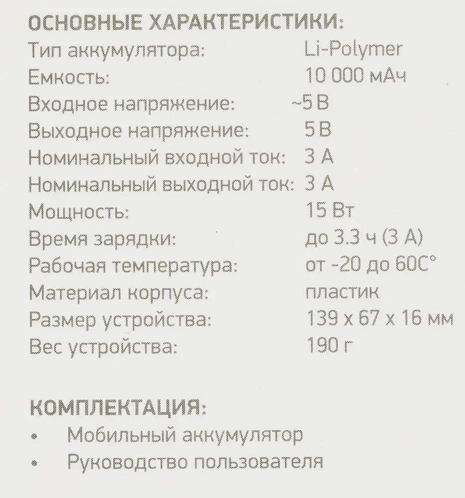 | Комплект поставки | внешний аккумулятор; гарантийный талон; инструкция |