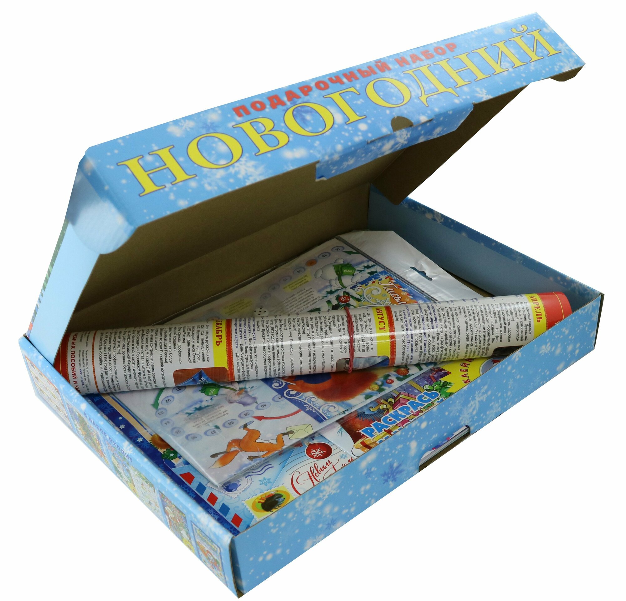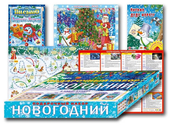 В наборе: пазл "Времена года. Зима", игра-ходилка "Письмо Деду Морозу", раскраска с наклейками "С Новым годом", календарь праздников, письмо Деду Морозу.