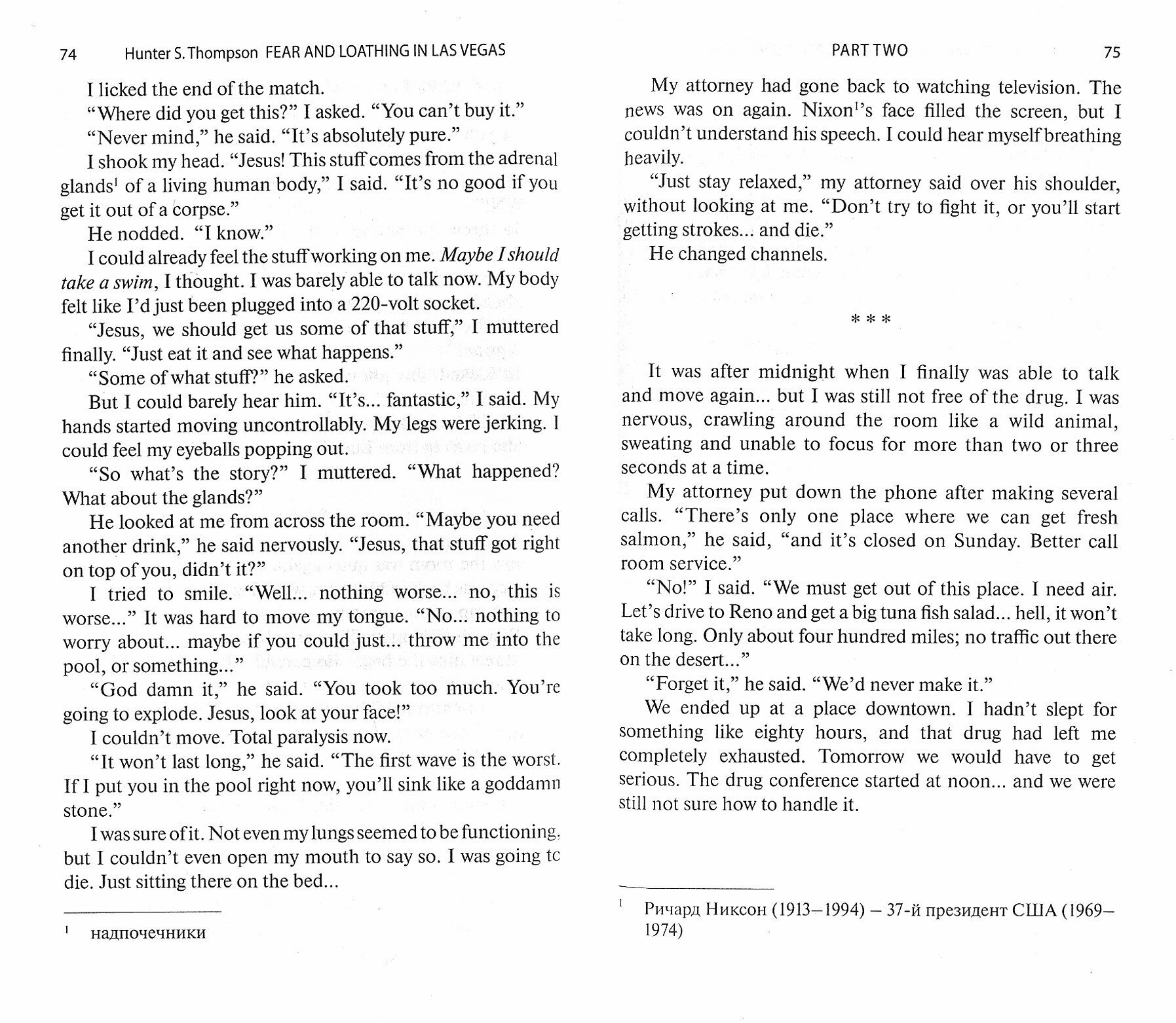 Безумно порадовало то, что нашел Хантера Томпсона в оригинале. Потрясающий слог полный сленга, что сильно упрощает изучение разговорного английского. Издание радует и тем, что имеют место быть комментарии, пояснения и небольшой словарь. Правда огорчило, что это не весь роман, а лишь отрывок. Однако даже так страх и ненависть в оригинале нечто невероятное!
