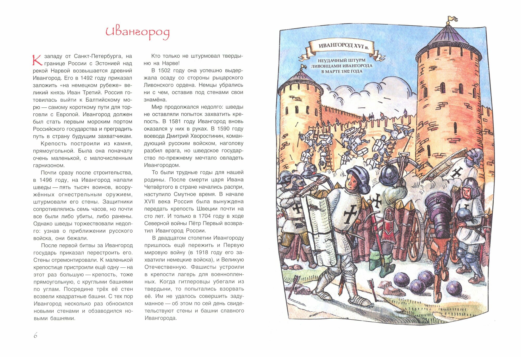 Книга очень познавательная,как и все остальные в этой серии.Написано доступным и понятным для детей языком.В ней рассказывается как строили крепости,как называются основные части,а также истории и легенды о крепостях Ивангород,Орешек,Старая Ладога,Изборск и другие.