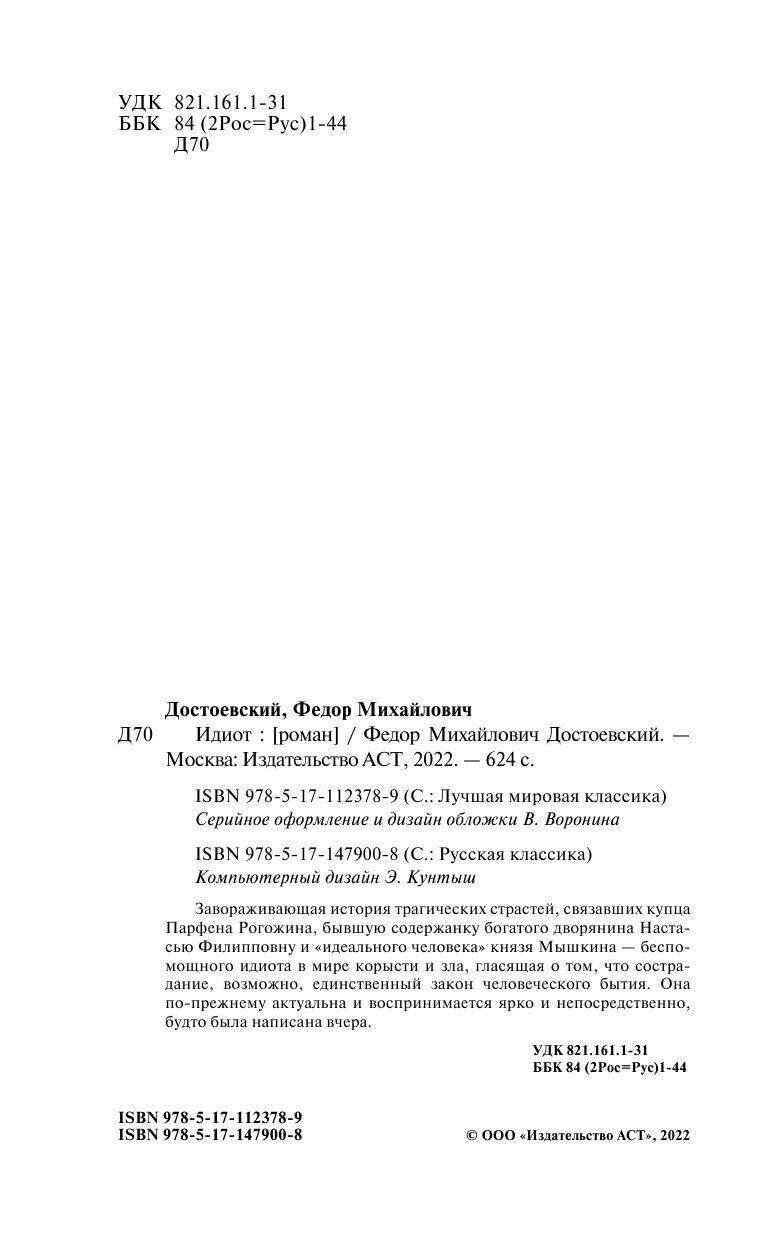 Роман, в котором творческие принципы Достоевского воплощаются в полной мере, а удивительное владение сюжетом достигает подлинного расцвета. Яркая и почти болезненно талантливая история несчастного князя Мышкина, неистового Парфена Рогожина и отчаявшейся Настасьи Филипповны, много раз экранизированная и поставленная на сцене, и сейчас завораживает читателя…
