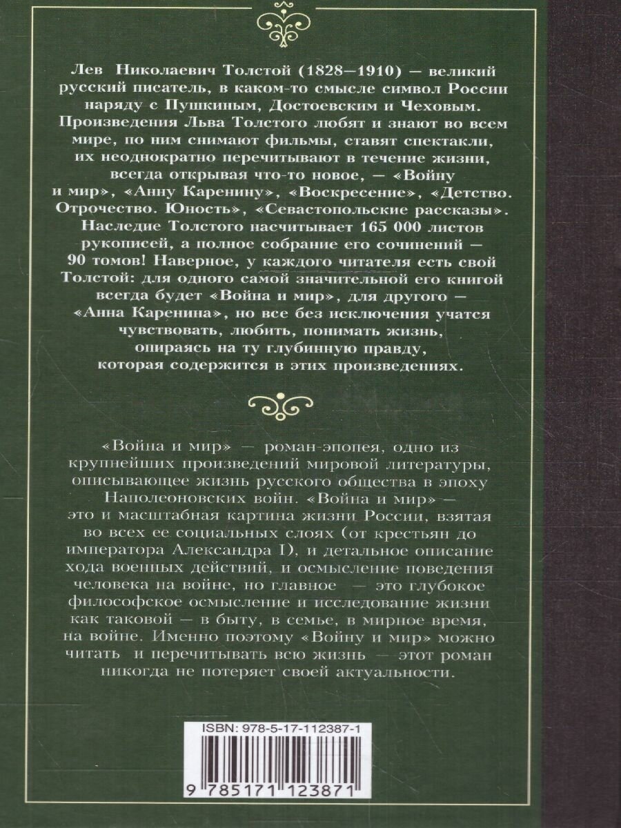 "Война и мир" - роман-эпопея Льва Толстого, одно из крупнейших произведений мировой литературы, описывающее жизнь русского общества в эпоху Наполеоновских войн. "Война и мир" - это масштабная картина жизни России, взятая во всех ее социальных слоях (от крестьян до императора Александра I), и детальное описание хода военных действий, и осмысление поведения человека на войне, но главное - это глубокое философское осмысление и исследование жизни как таковой - в быту, в семье, в мирное время, на войне.