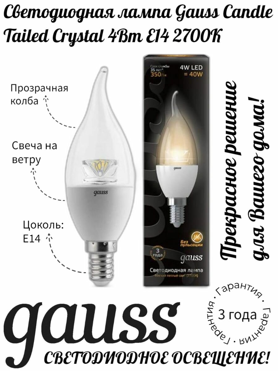 Светодиодная лампа Gauss - свеча на ветру с прозрачным стеклом идеально подходит к установке в хрустальные люстры, бра.