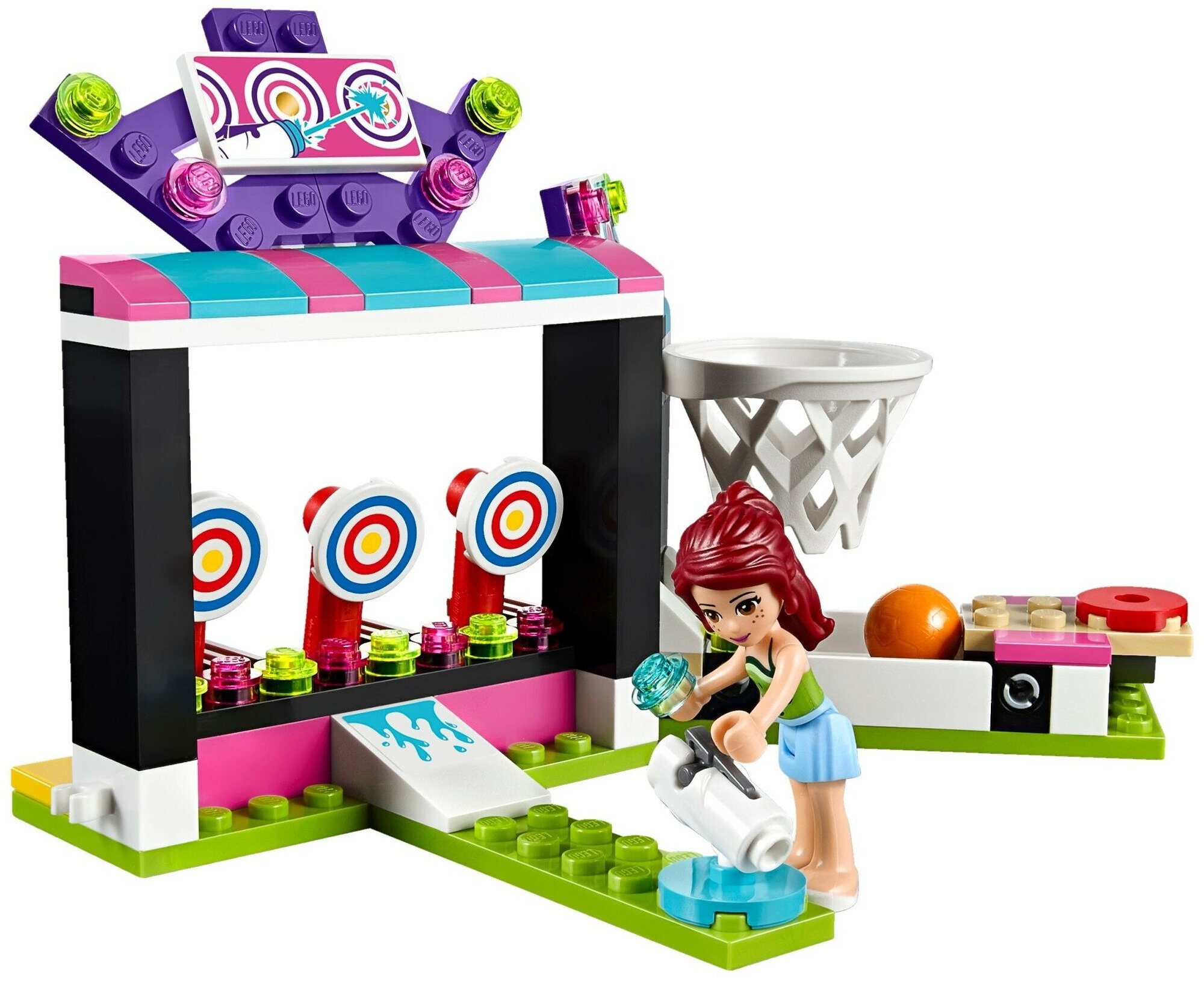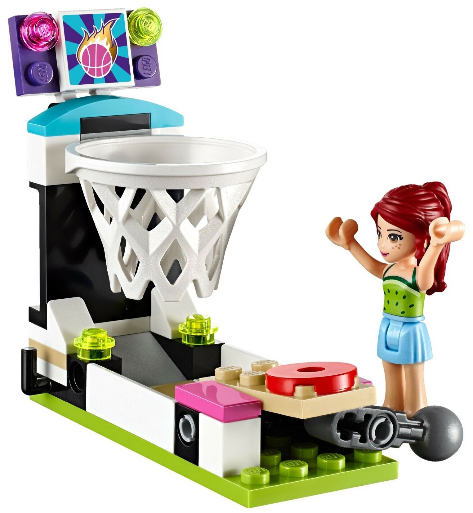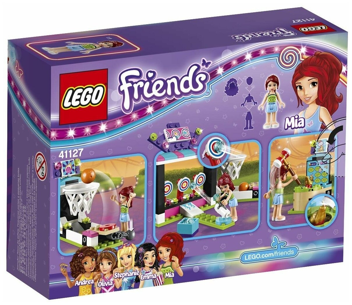 LEGO Friends 41127 Парк развлечений: игровые автоматы - набор, который сможет заинтересовать Вашего маленького исследователя. Игрушечный город неуклонно развивается, постепенно радуя своих жителей новыми возможностями для активного отдыха после трудовой недели. Теперь парк стал настоящим эпицентром веселого отдыха: новые игровые автоматы собирают немалую очередь, и это неудивительно. Пытливые жители стремятся проверить свою сноровку и ловкость, пробуя попасть молоточком по лягушке или стреляя по целям при помощи водного пистолета. Особо спортивно настроенных граждан можно заметить у баскетбольного кольца, кажется, там объявился непризнанный ранее герой. Попробуй и ты завоевать звание и получить приз!