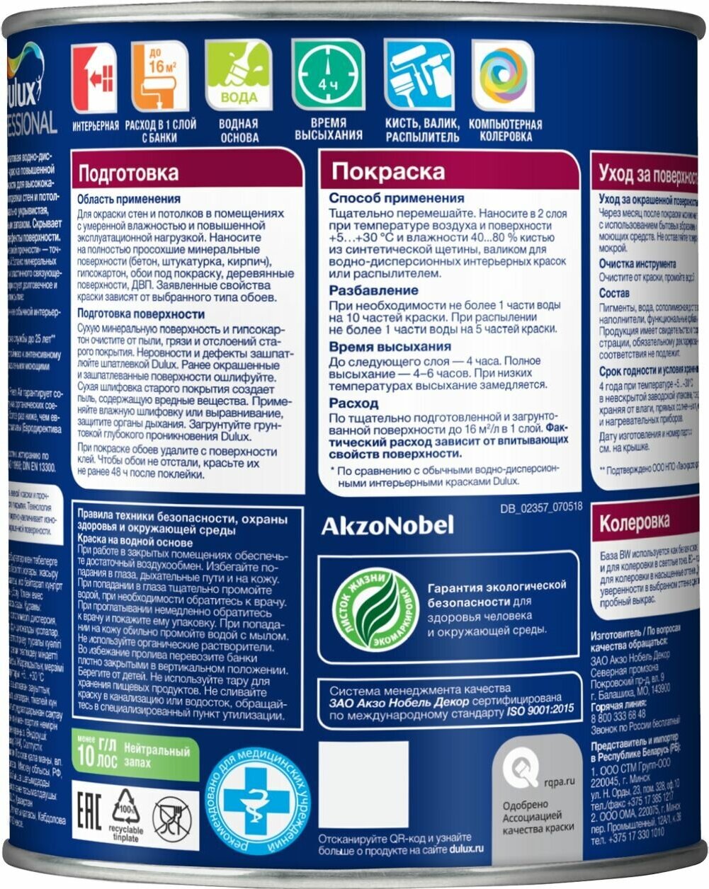 | Особенности | База BW может применяться как белая краска, т.е. использоваться самостоятельно, без колеровки. Также предназначена для получения светлых и пастельных оттенков. |