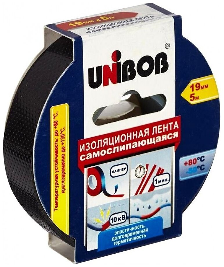 Клейкая лента электроизоляционная самослипающаяся 19мм х 5м, черныйКлейкая лента электроизоляционная Unibob. Рекомендована при проведении электроизоляционных работ. При наложении одного витка на другой происходит самовулканизация, образуется монолитный слой изоляции, что гарантирует долговременную герметичность. Основные преимущества ленты: -Изолента устойчива к воздействию внешней среды; -Эластичность; -Напряжение пробоя: 10 000 В; -Долговременная герметичность. Основа: этиленпропиленовая резина; Клеевой слой: натуральный каучук; Стандартные размеры: 19 мм х 5 м. Красочная информативная коробка, с подробной инструкцией по применению и вырубкой под еврокрючок. Условия хранения: хранить при температуре от 18 до 21 градуса и относительной влажности около 50%. Рабочая температура: от 50 до 80 градусов. Количество лент в упаковке - 1 шт.