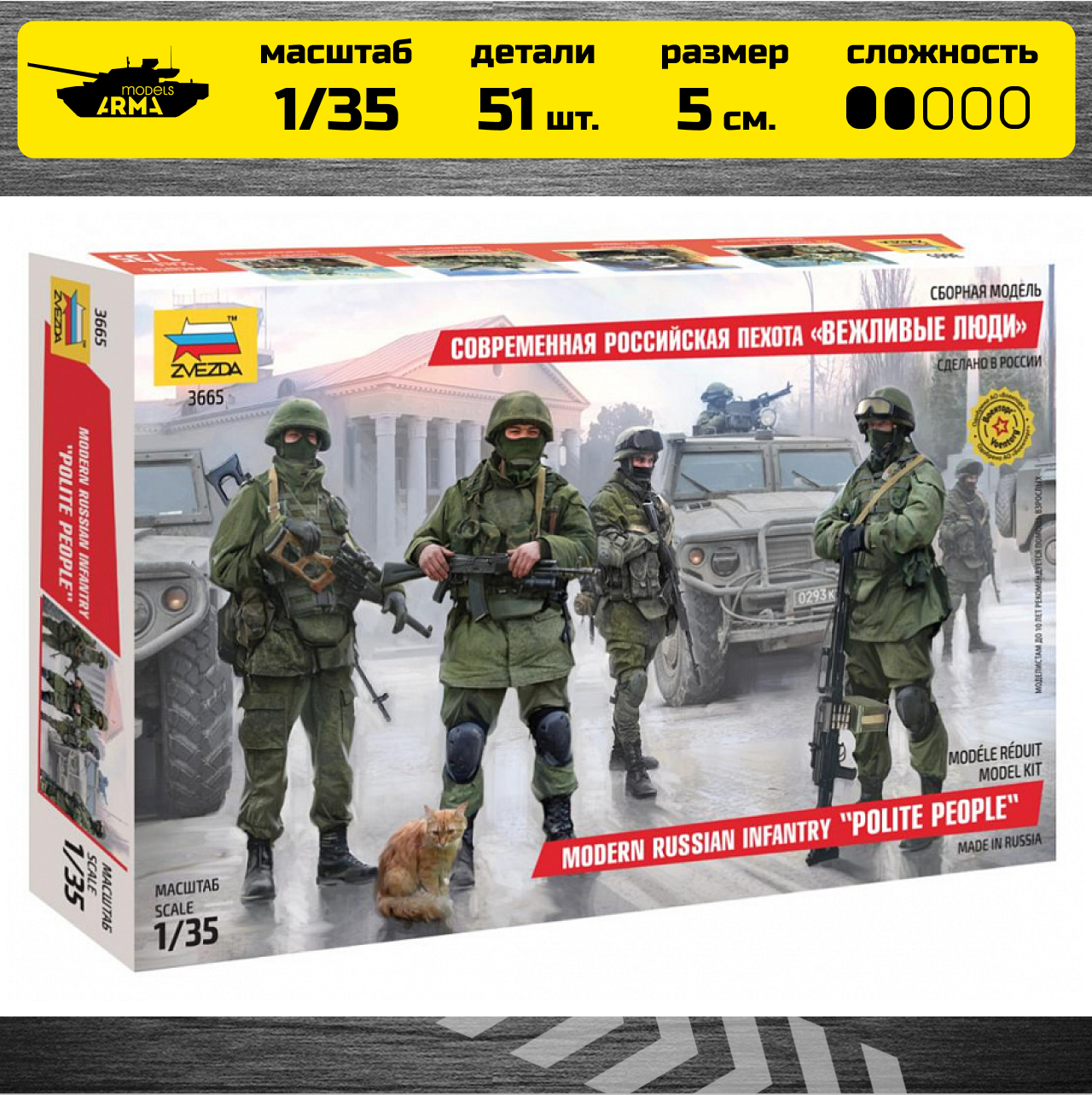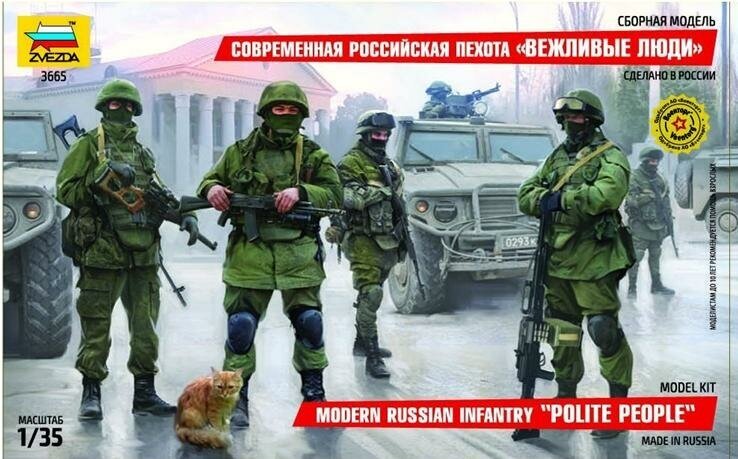 Этот набор подарит юному моделисту возможность своими руками собрать из имеющихся деталей 4 солдатиков и кота. Пехотинцы выполнены в виде членов спецподразделения Российской армии, которым люди уже успели дать прозвище "Вежливые люди". Фигурки выполнены с большим вниманием к деталям, имеют приятный внешний вид. Стоит отметить, что собранные модельки можно раскрасить в соответствующие цвета. Для примера стоит использовать изображение с коробки. "Вежливые люди" займут достойное место на полке любого коллекционера.Внимание! Краски в комплект не входят.
