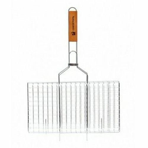 | Способ применения | 1. Снять защитные колпачки с «усиков» решетки, сдвинуть фиксирующее кольцо к рукоятке. 2. Поднять верхний сегмент решетки, расположить кусочки на нижней плоскости решетки. 3. Прижать продукты верхним сегментом решетки, закрепить фиксирующее кольцо. 4. Жарить, переворачивая решетку по мере необходимости. |