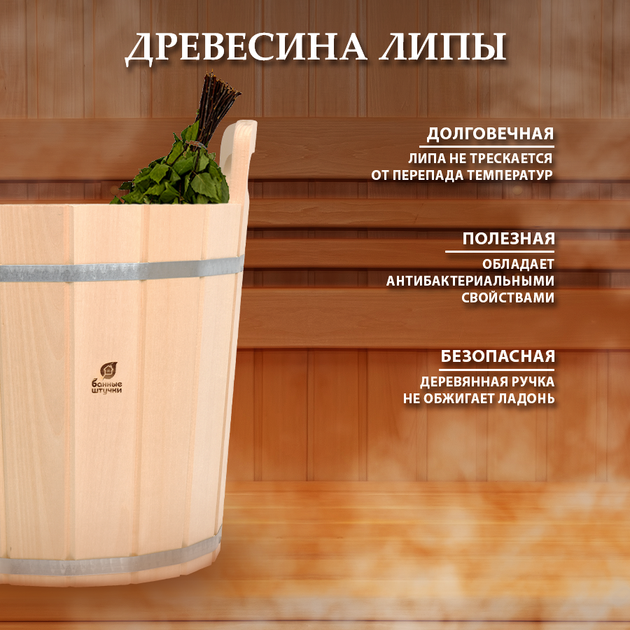 Запарник "Банные штучки" выполненый из липы с нержавеющей вставкой является незаменимым помощником в бане. В запарнике можно развести ароматические масла, распарить банный веник или просто использовать его для хранения воды. Благодаря металлической вставке, вода не оказывает пагубного воздействия на дерево, что защищает его от плесени и грибка. Объем: 20л. Срок годности не ограничен.