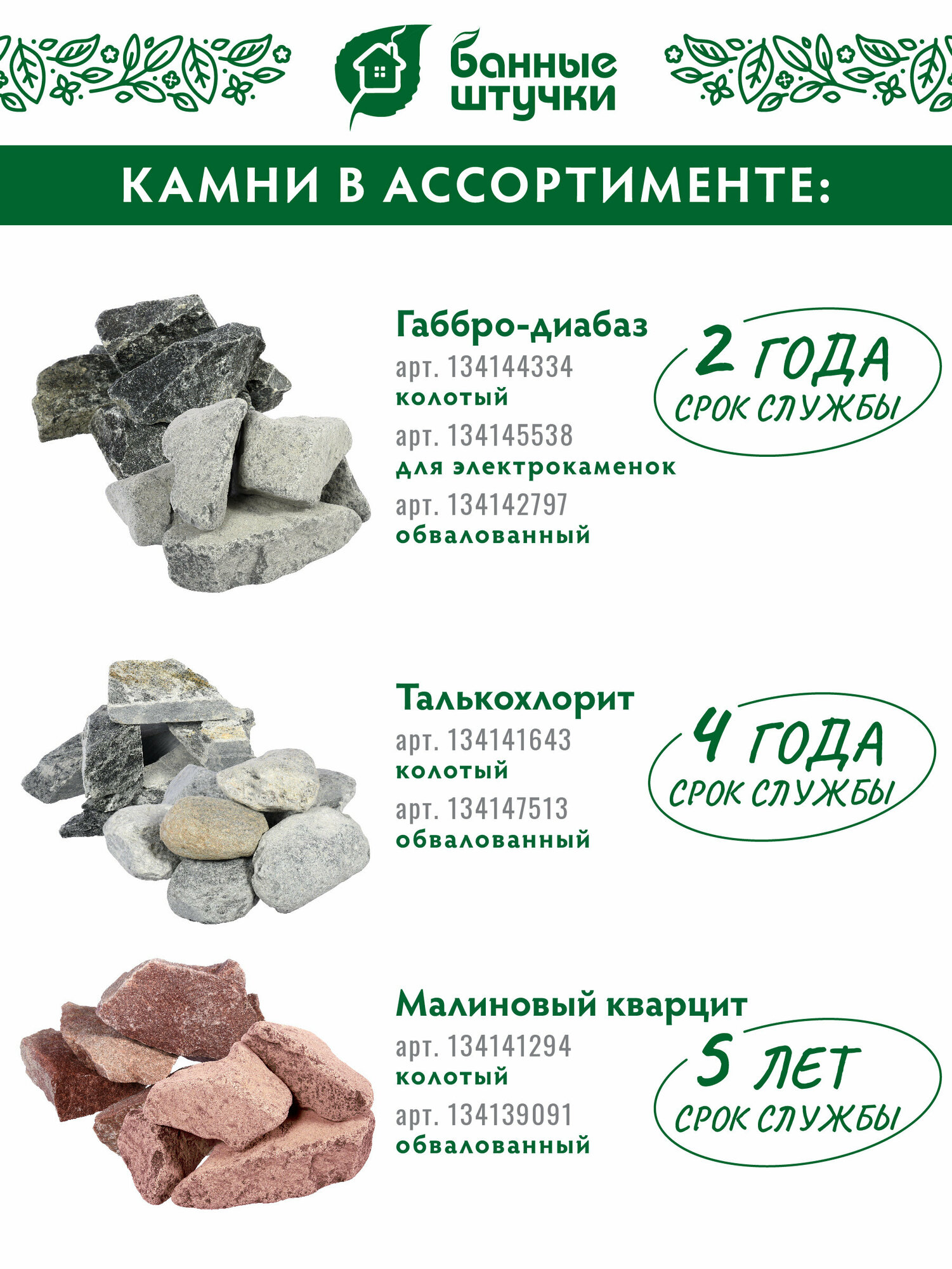 Камень Банные штучки "Габбро-диабаз" — прочная порода вулканического происхождения, имеет однородную структуру, хорошо аккумулирует и отдает тепло. Равномерно нагревается и расширяется по всей массе и направлениях соответственно. Вес: 20кг. Колотый, мелкая фракция.