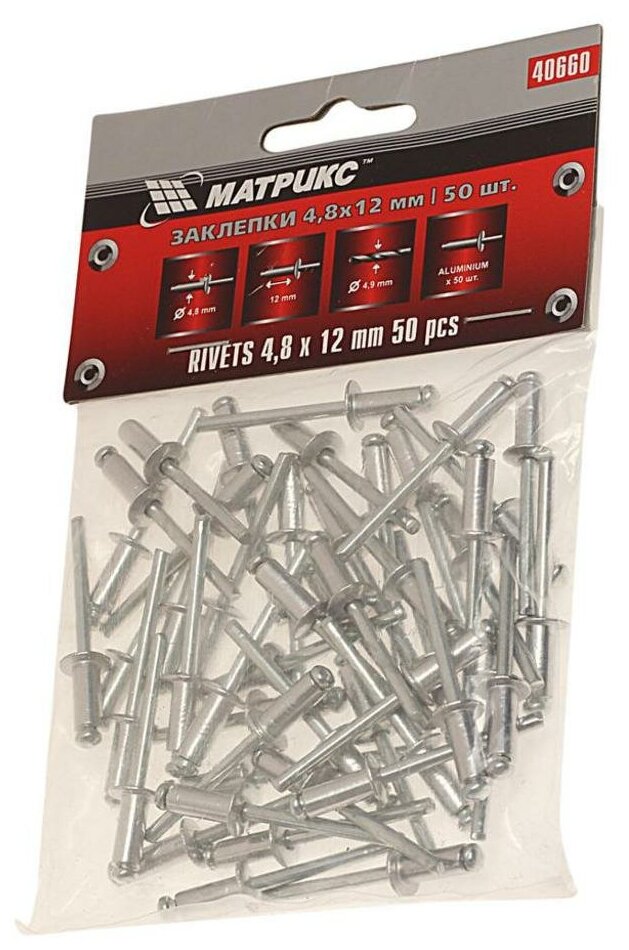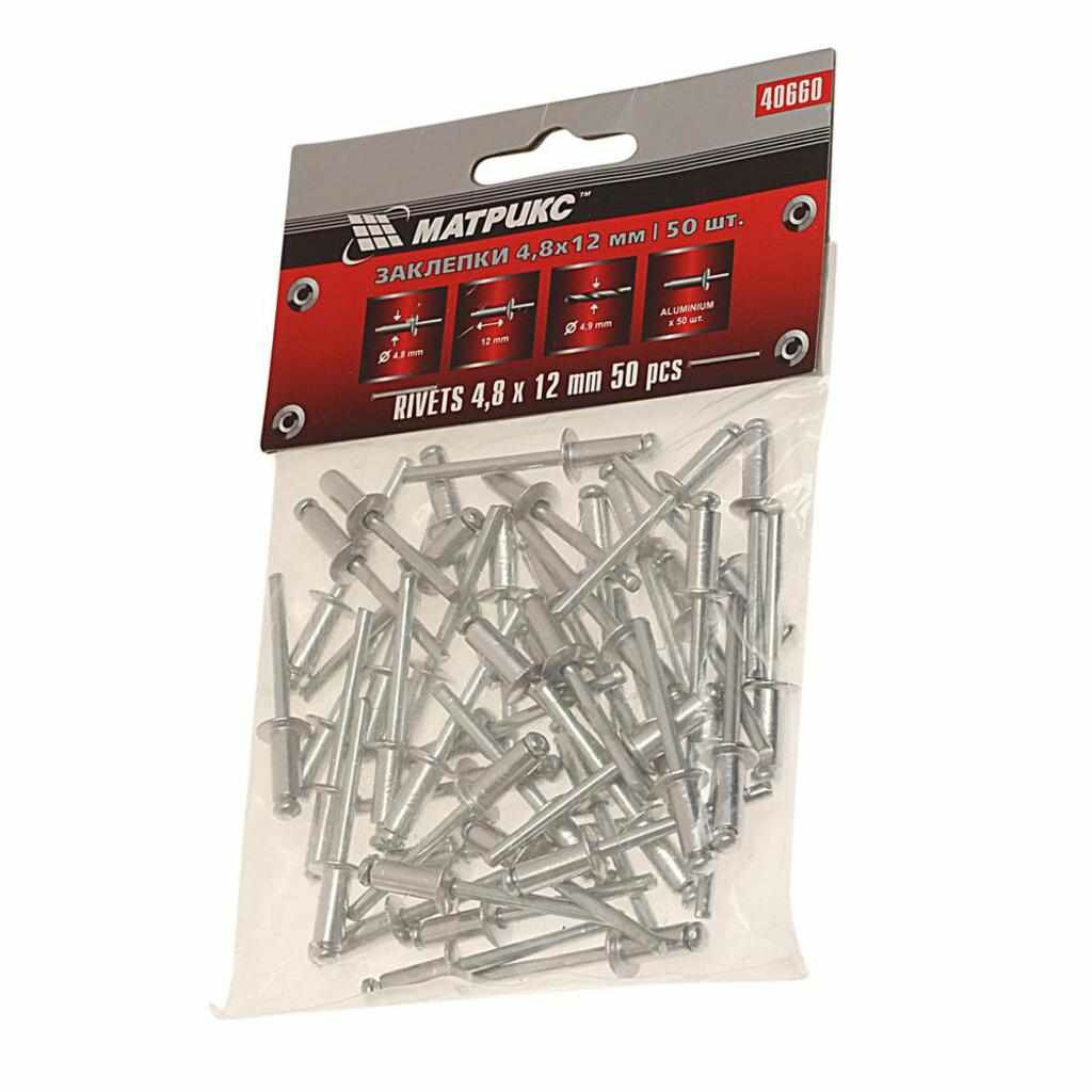 Заклепки, 4,8 х 12 мм, 50 шт,// MATRIX отлично подходят для соединения двух материалов при помощи электрозаклепочника. Соединяет очень прочно и качественно. Благодаря оптимальному количеству, хватит на все нужды.