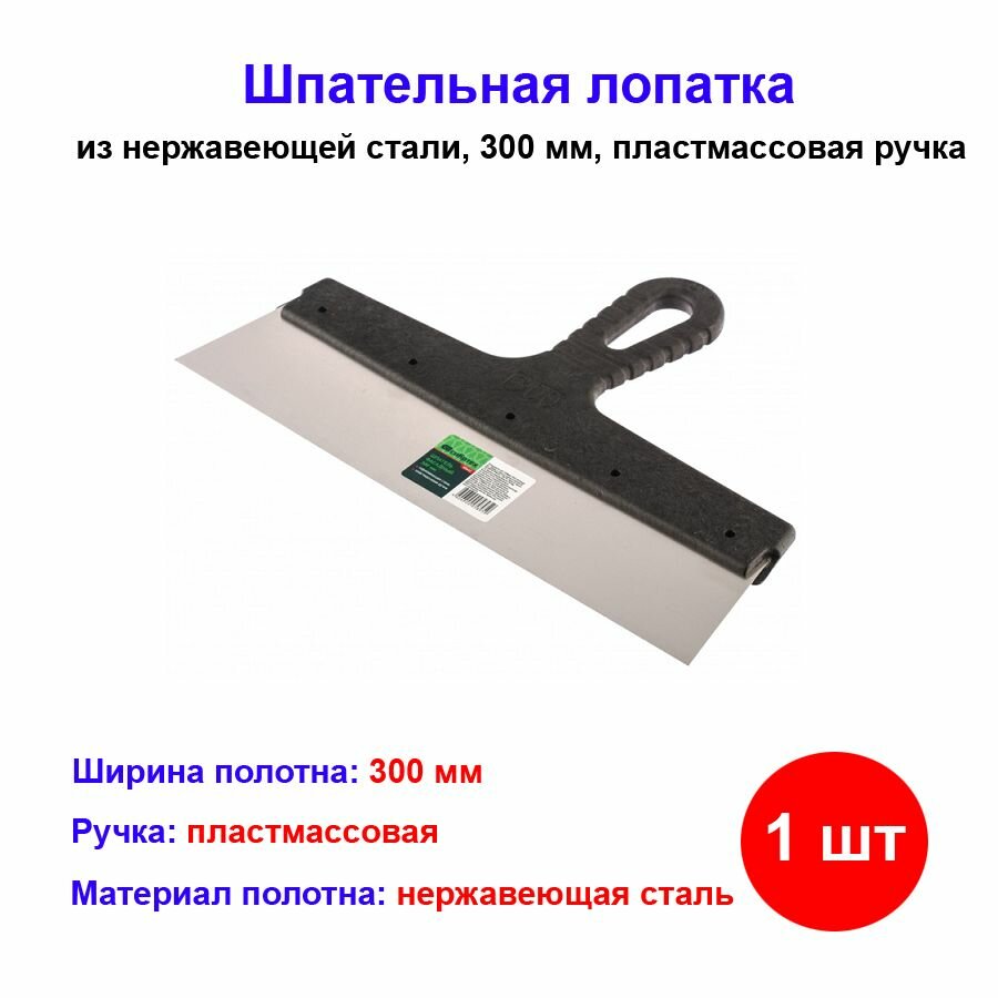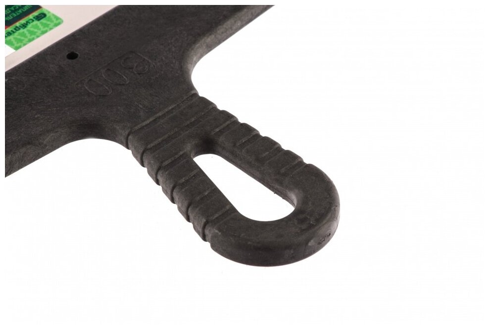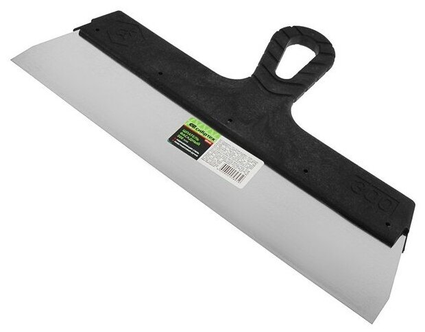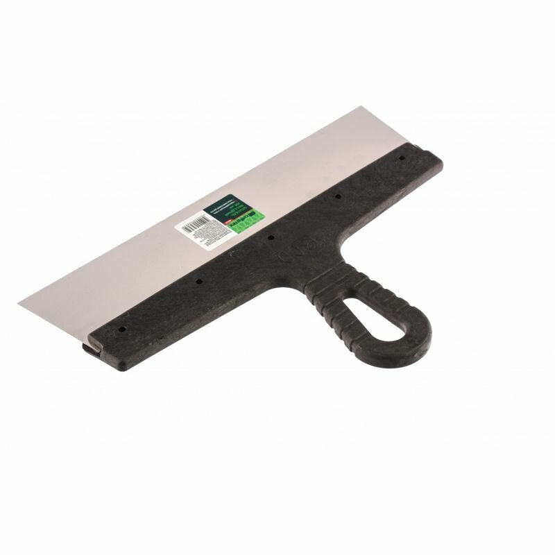| Прочие особенности и свойства | Полотно шпателя изготовлено из нержавеющей стали. Облегченная ручка из ударопрочной пластмассы., Ручка шпателя имеет специальную изогнутую форму, что обеспечивает максимально удобную работу., Шпатель предназначен для нанесения, выравнивания и сглаживания шпаклевочного слоя на больших и малых поверхностях. |