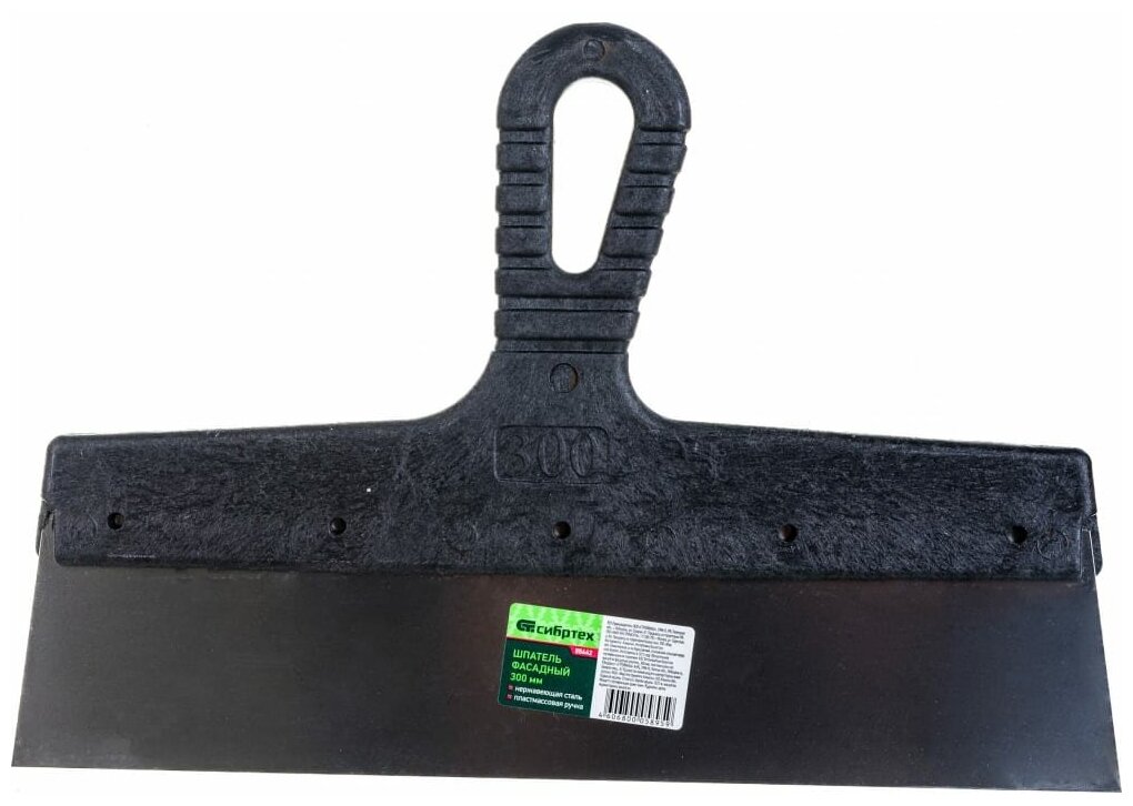 Фасадный шпатель Сибртех 300 мм используется для нанесения и равномерного распределения строительных смесей на различных поверхностях. Подходит как для внутренней, так и для наружной отделки. Инструмент состоит из рифленой отогнутой рукоятки и стального рабочего полотна.