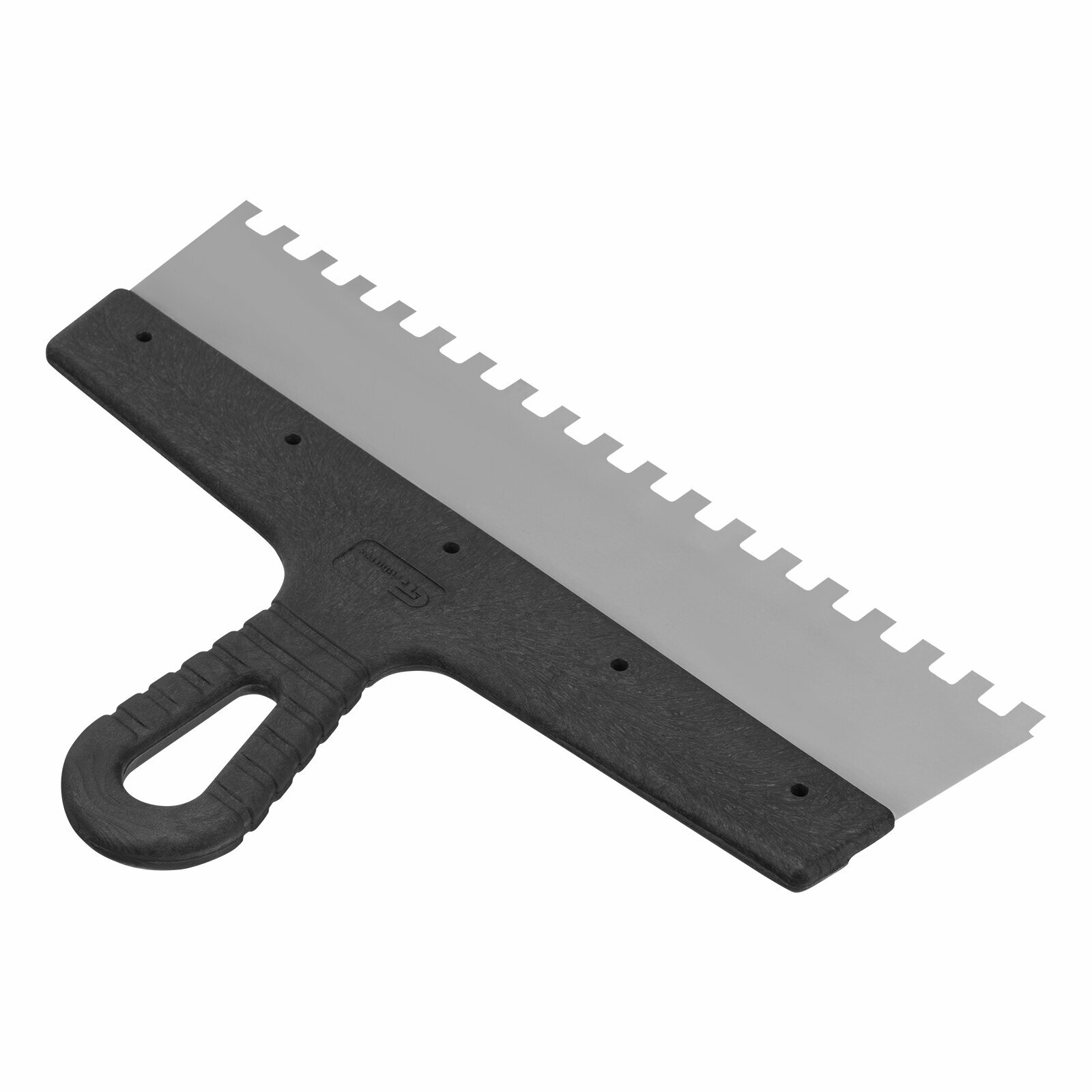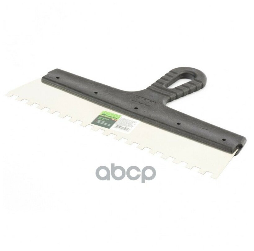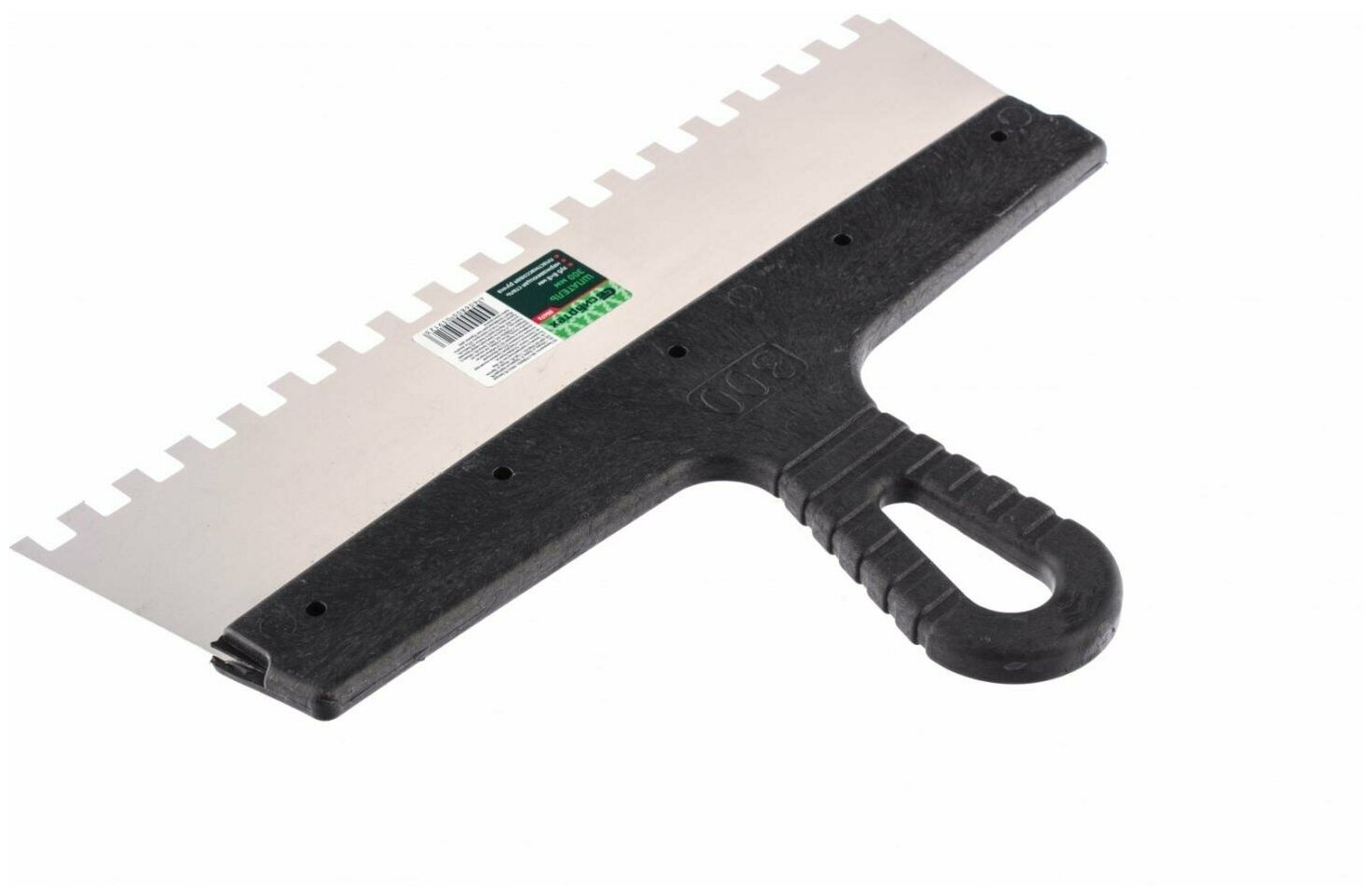 | Прочие особенности и свойства | Полотно шпателя изготовлено из нержавеющей стали., Рабочая поверхность инструмента имеет квадратные зубья., Облегченная ручка из ударопрочной пластмассы., Ручка шпателя имеет специальную изогнутую форму, что обеспечивает максимально удобную работу., Шпатель предназначен для нанесения, выравнивания и сглаживания шпаклевочного слоя на больших и малых поверхностях. |