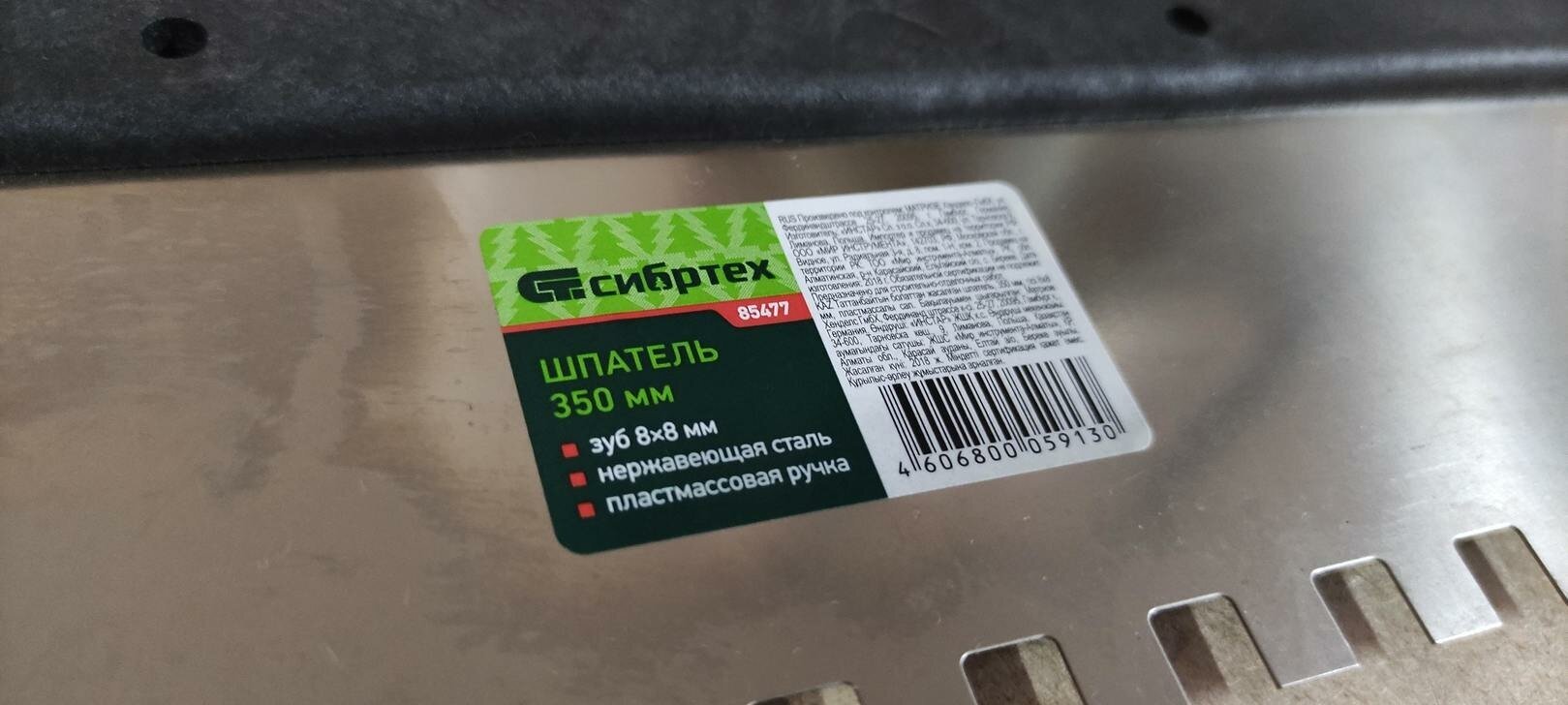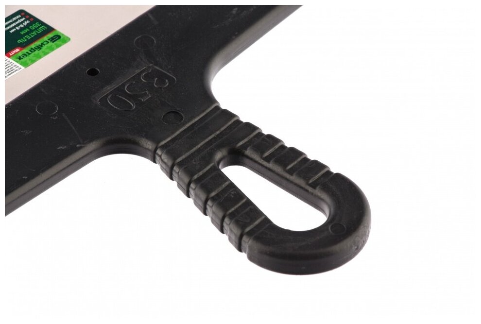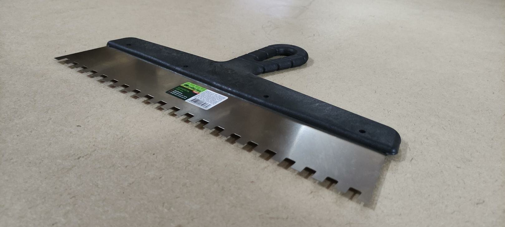| Прочие особенности и свойства | Полотно шпателя изготовлено из нержавеющей стали.,Рабочая поверхность инструмента имеет квадратные зубья.,Облегченная ручка из ударопрочной пластмассы.,Ручка шпателя имеет специальную изогнутую форму, что обеспечивает максимально удобную работу.,Шпатель предназначен для нанесения, выравнивания и сглаживания шпаклевочного слоя на больших и малых поверхностях. |