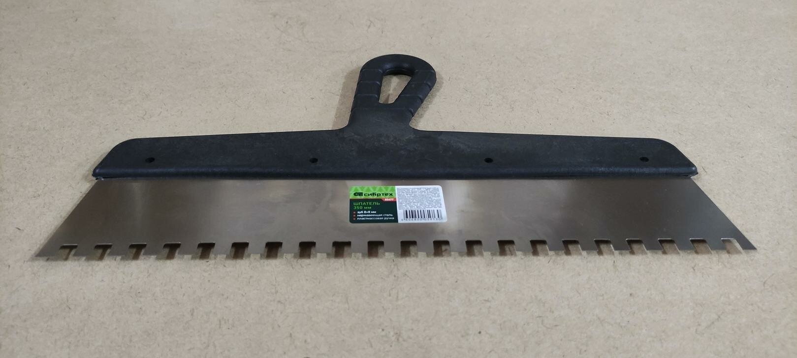 Полотно шпателя изготовлено из нержавеющей стали 30Х13 (12Х17). Рабочая поверхность инструмента имеет квадратные зубья. Облегченная ручка из ударопрочной пластмассы. Ручка шпателя имеет специальную (изогнутую) форму, что обеспечивает максимально удобную работу. Шпатель предназначен для нанесения, выравнивания и сглаживания шпаклевочного слоя на больших и малых поверхностях.