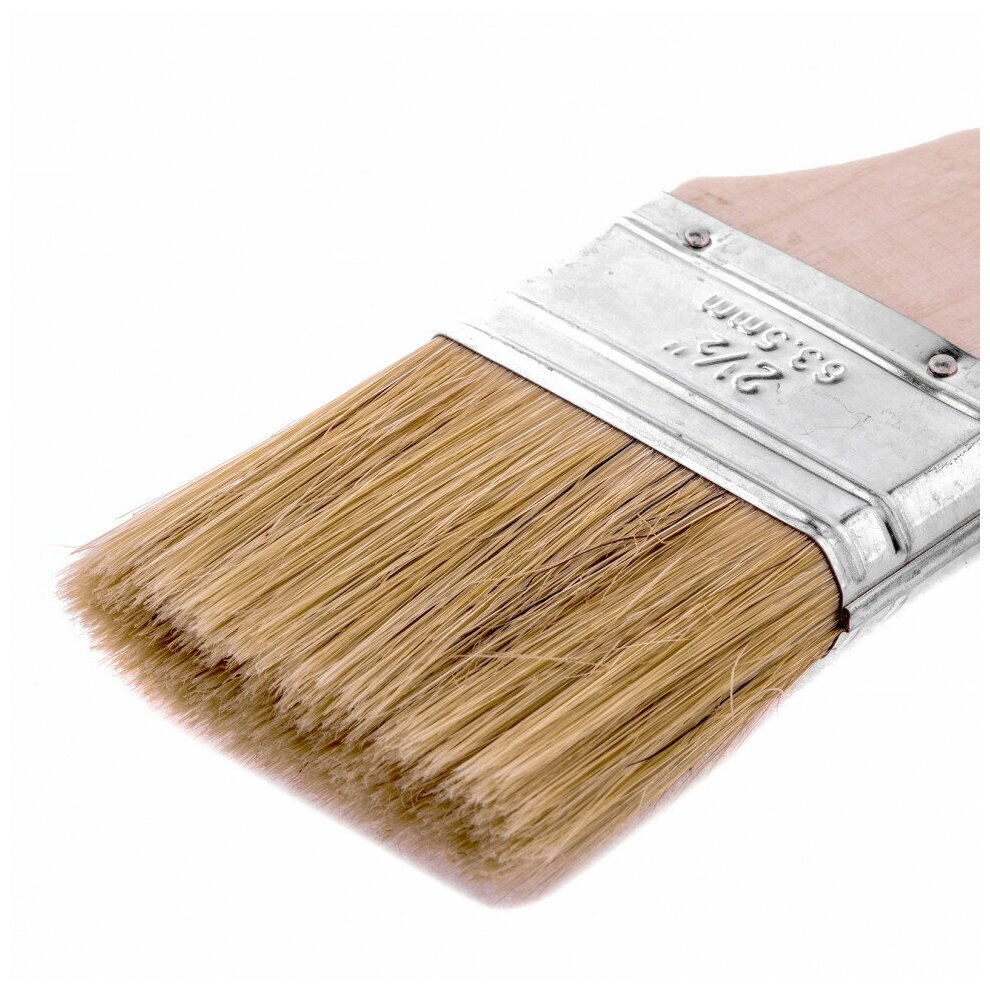 Ворс кисти из натуральной щетины двойной выварки. Щетина расщеплена на концах. Толщина кисти от 10,5 до 22 мм. Щетина кисти надежно закреплена металлическим бандажом с антикоррозийным покрытием. Деревянная лакированная ручка с отверстием для подвешивания