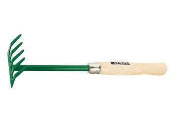 Грабли 5-зубые с эргономичной деревянной рукояткой. Ширина рабочей части 90 мм, общая длина 340 мм. Предназначены для сбора срезанных побегов, рыхления и выравнивания почвы на небольших грядках и клумбах. Рабочая часть выполнена из инструментальной стали У8 и окрашена порошковой эмалью для предохранения от коррозии. Рукоятка выполнена из вяза и для защиты пропитана маслом. По окончании работы необходимо очистить рабочую часть инструмента от остатков грунта.