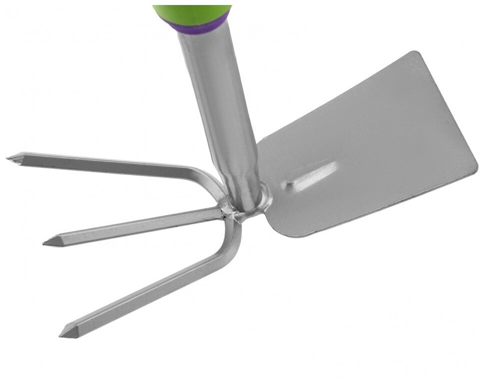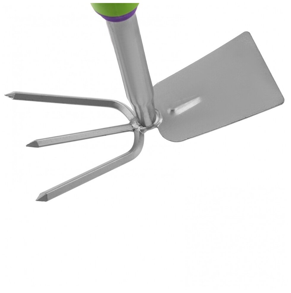 Мотыжка комбинированная, профиль ''трапеция'' и три зубца, с обрезиненной рукояткой, которую при необходимости можно удлинить. Ширина рабочей части 65 мм, общая длина 290 мм.