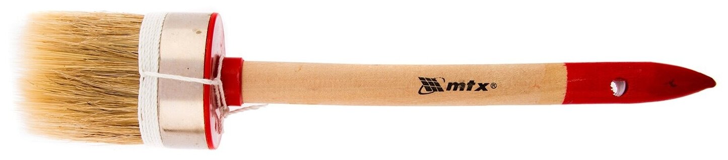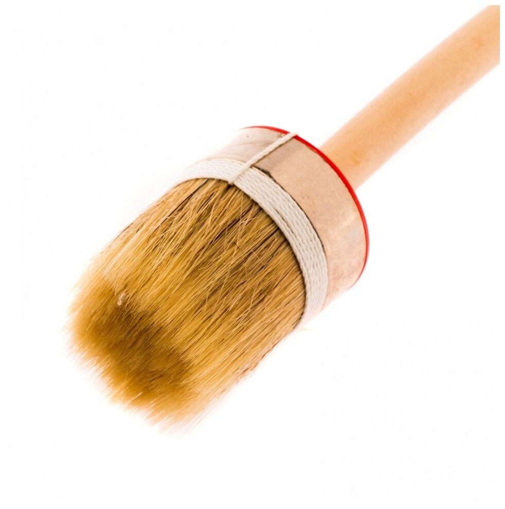 Ворс кисти из натуральной светлой щетины, расщепленной на концах. Диаметр кисти от 20 до 55 мм. Щетина кисти надежно закреплена металлическим бандажом. Ручка изготовлена из дерева. Кисть предназначена для работ с масляными красками и лаками.