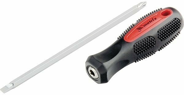 Комбинированная отвертка SL6.0, PH2 мм MATRIX с профилями прямой шлиц (SL – 6 мм) и Phillips (PH – №2) изготовлена из высокопрочной хромованадиевой стали. Рукоятка имеет двухслойное прорезиненное покрытие, не скользящее при работе.