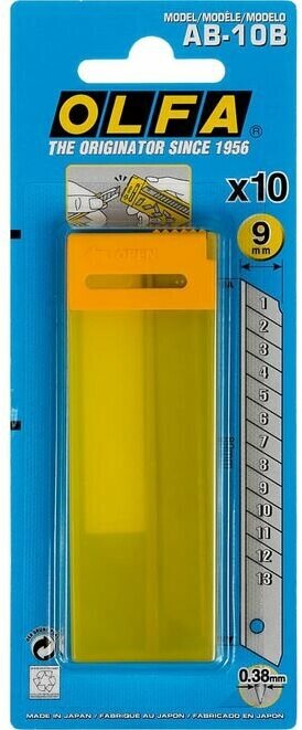 Лезвие OLFA (Олфа) - это универсальное прочное сегментированное лезвие шириной 9 мм. Лезвие выполнено из инструментальной стали с точной заточкой. Лезвие разделено на 13 сегментов. Комплект-упаковка лезвия состоит из 10 штук.
