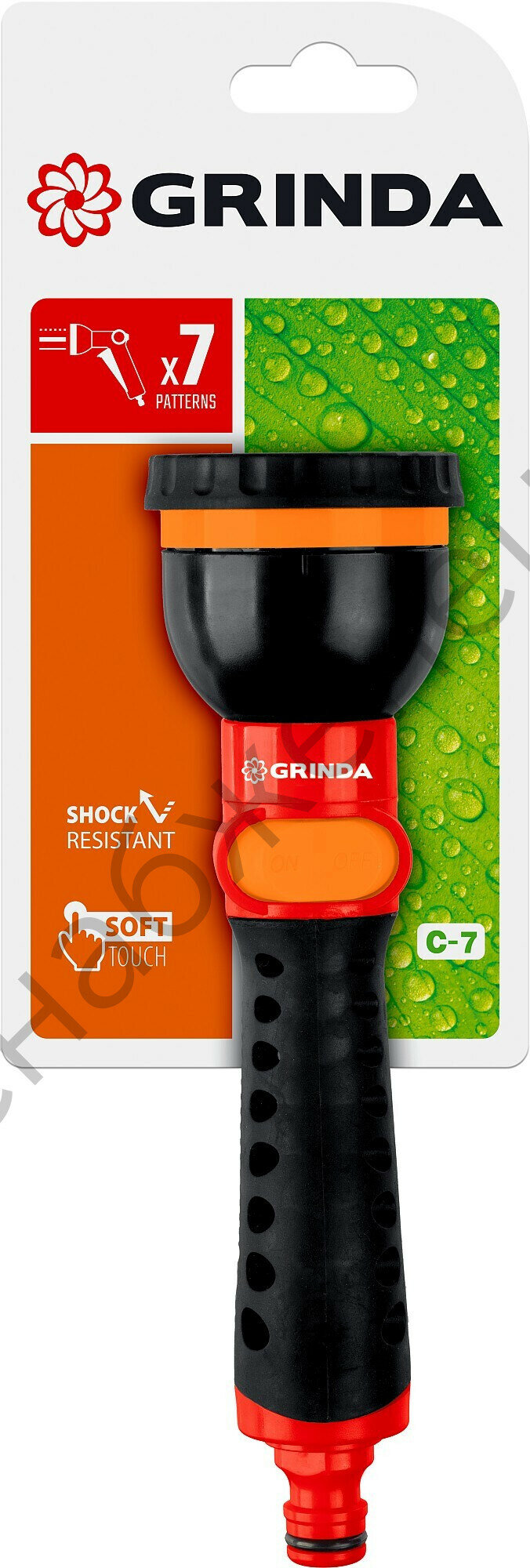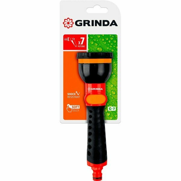 Наконечник поливочный GRINDA, 7-ми позиционный ( ) Предназначен для направленного полива растений при подключении к водопроводному шлангу с помощью соединителя. Изготовлен из ударопрочного ABS-пластика. Регулировка полива осуществляется путем выбора одного из следующих 7-ми режимов распыления: сильная струя, конус, центр, плоская струя, душ, аэрирование, слабая струя. Двухкомпонентная рукоятка обеспечивает удобство захвата для руки.