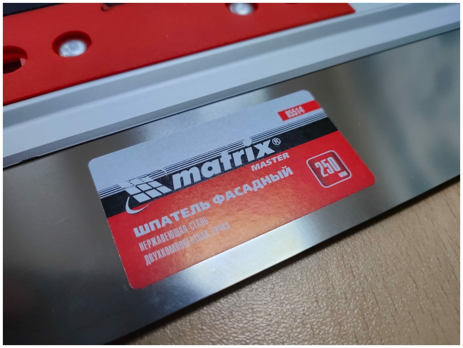 | Прочие особенности и свойства | Фасадный шпатель 250 мм MATRIX MASTER 85514 используется для нанесения и разравнивания штукатурных смесей и шпатлевок на большие поверхности. Инструмент удобен в использовании благодаря специальной двухкомпонентной ручке, имеющей изогнутую форму. На рукоятке предусмотрено отверстие - шпатель можно хранить в подвешенном состоянии. Рабочая часть приспособления выполнена из нержавеющей стали. |