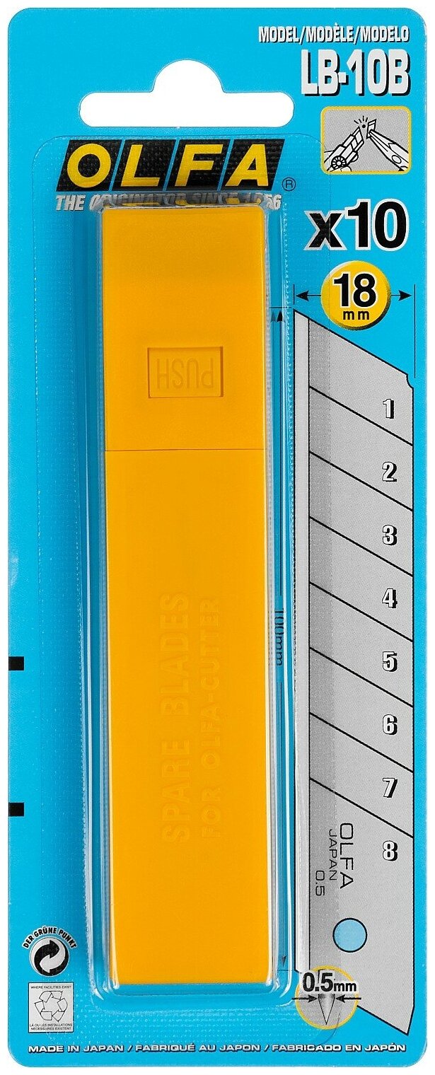 Сегментированные лезвия OLFA 18х100х0.5 мм 10 шт. изготовлены из высококачественной японской инструментальной стали и профессионально заточены для обеспечения превосходной остроты и непревзойденной долговечности режущей кромки. Лезвия имеют глубокую и гладкую сегментную линию для легкого отламывания. Упакованы в удобный футляр для переноски и хранения.