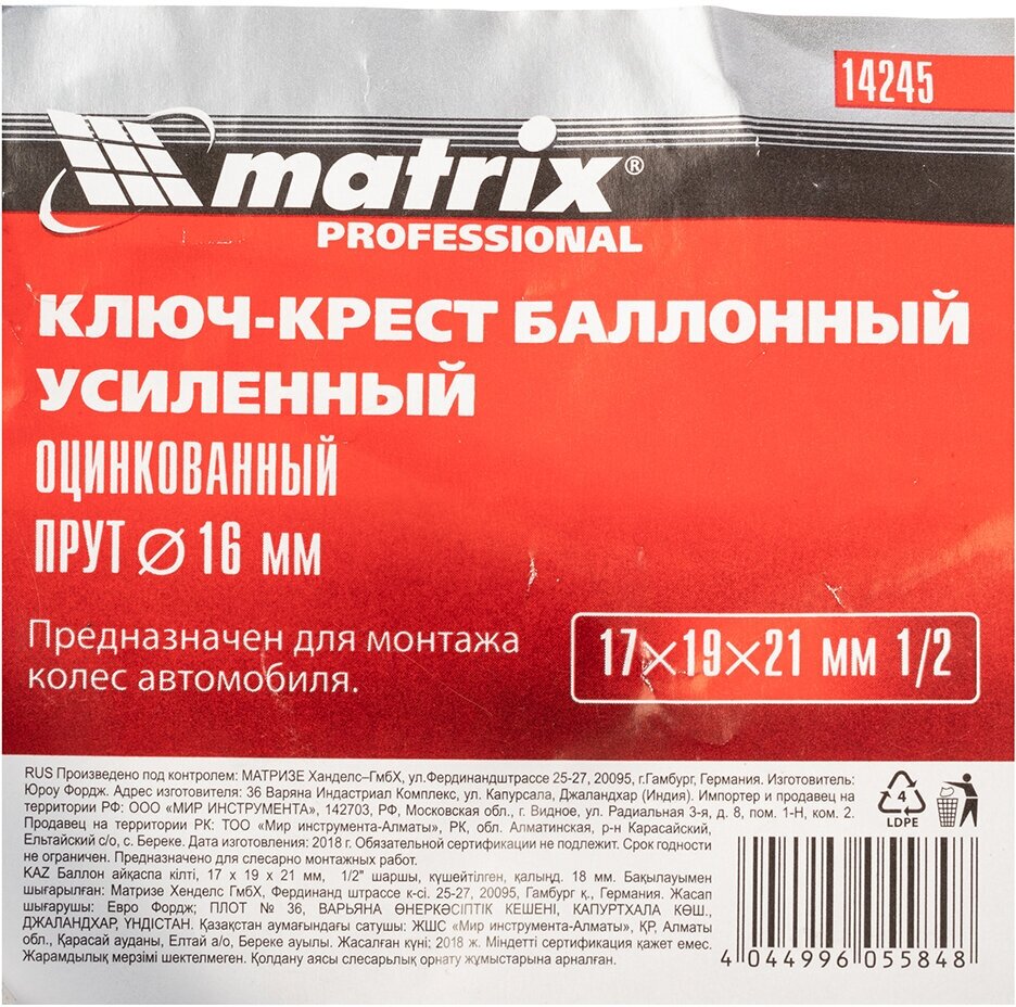 Баллонный ключ-крест MATRIX 14245 (размер: 17х19х21)